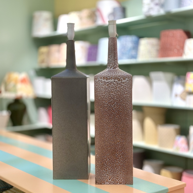 Vi har to farver og der følger en original firkantet skærm gratis med til den rødlige/bordo, men den har skader. Lamperne er lavet på Palshus for Le Klint og begge har Le Klint skrevet under bunden.