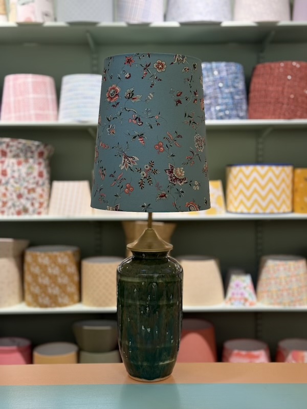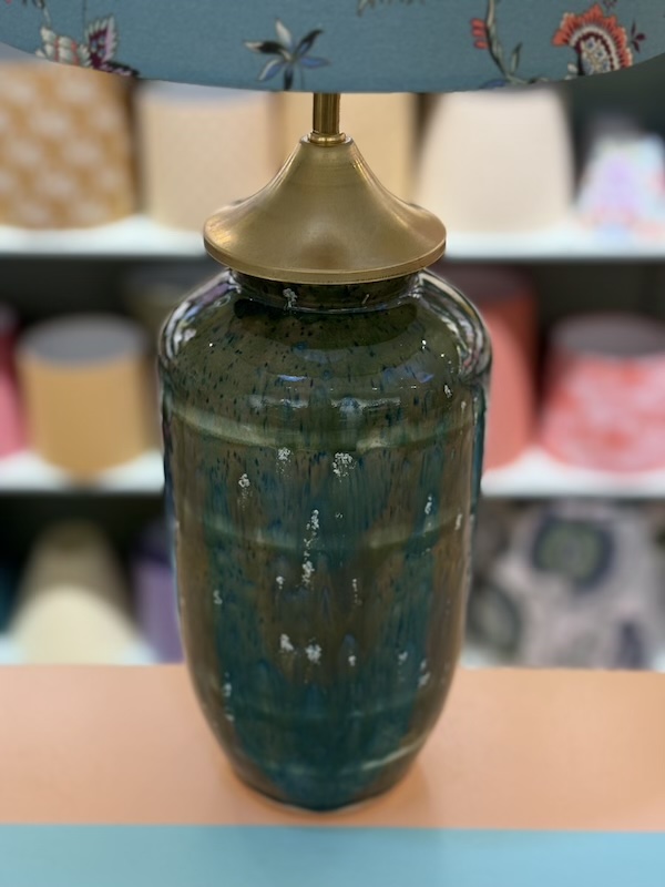 Den høje lampe har en dyb grøn glasur med levende spil og små lyse detaljer, der giver et organisk og kunstnerisk udtryk – Lampen er unika og en del af den seneste kollektion – Ledning med afbryder samt krave og fatning i messing.