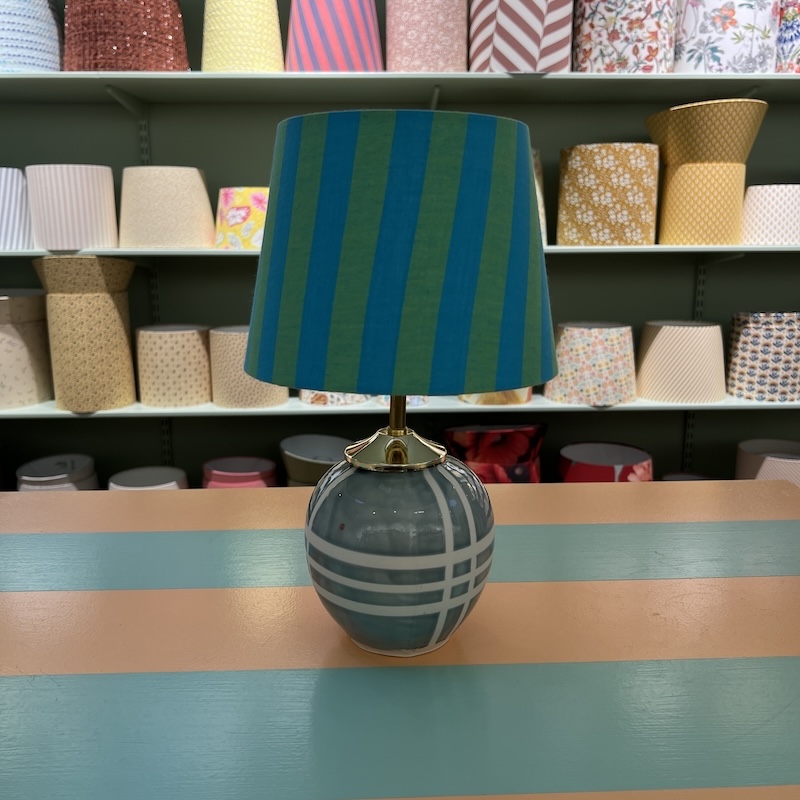 Den elegante bordlampe har en blank, lyseblå glasur med håndmalede hvide striber, der giver et rent, grafisk og moderne udtryk. Hver lampe er håndlavet og helt unik – en del af den nyeste kollektion fra The Potteria. Ledning med afbryder samt krave og fatning i messing (vores skærme passer direkte på denne fatning).