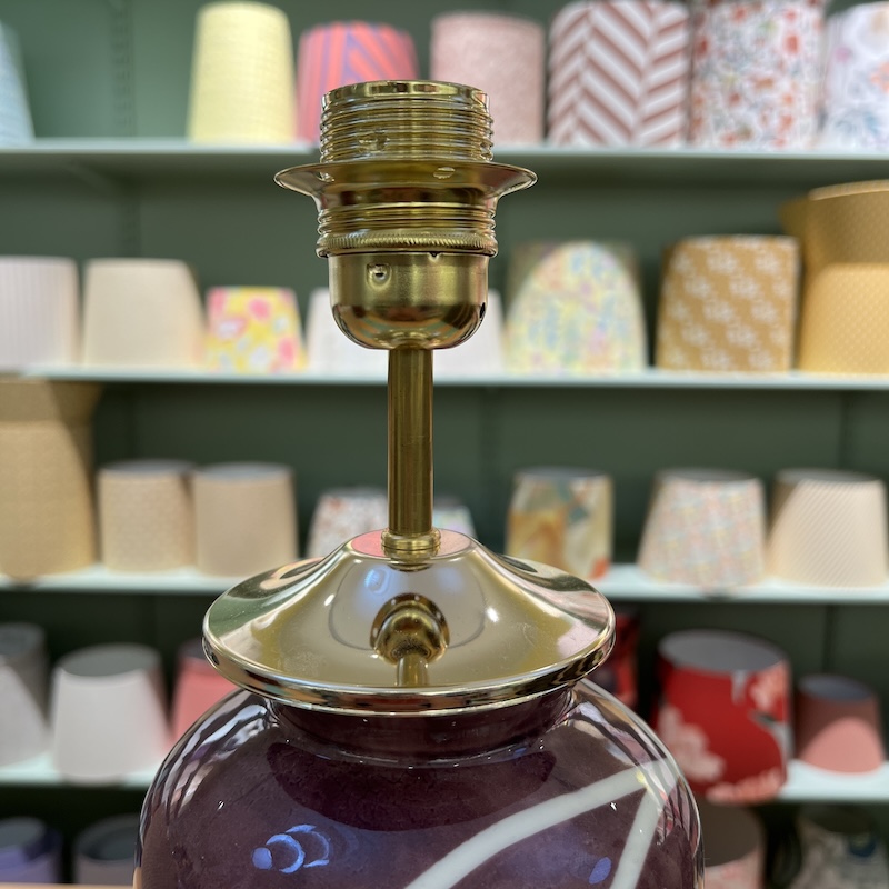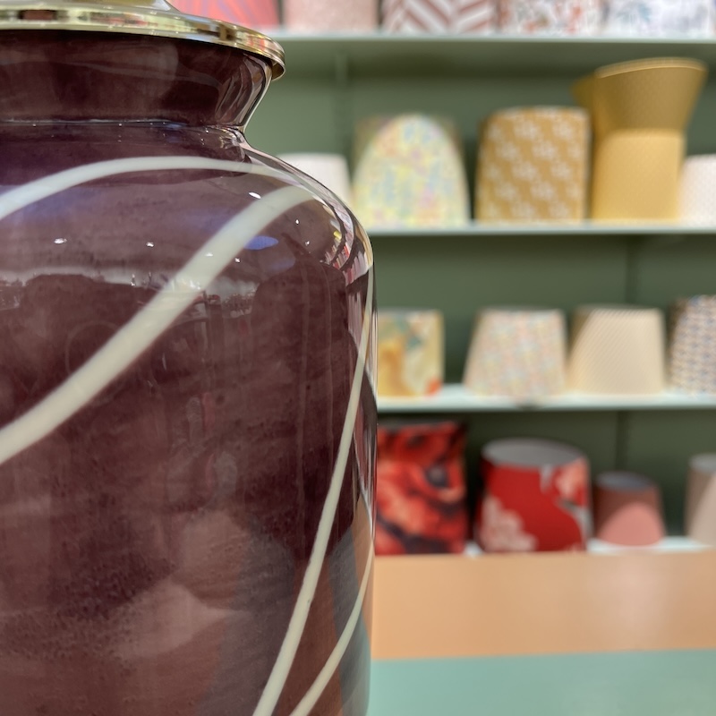 Den elegante bordlampe har en dyb, lilla glasur med håndmalede lyse striber, der skaber et moderne, grafisk og kunstnerisk udtryk. Den aflange form giver lampen et stilfuldt og skulpturelt præg. Hver lampe er håndlavet og helt unik – en del af den nyeste kollektion fra The Potteria. Ledning med afbryder samt krave og fatning i messing (vores skærme passer direkte på denne fatning).