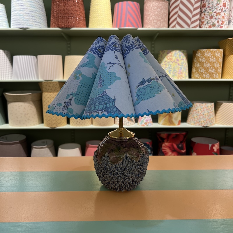 Den kunstneriske bordlampe har en dyb, lilla glasur på den øverste del, der smelter smukt sammen med en blå, krystalliseret struktur nederst. Den markante tekstur og de levende farver giver lampen et skulpturelt og sanseligt udtryk. Hver lampe er håndlavet og helt unik – en del af den nyeste kollektion fra The Potteria. Ledning med afbryder samt krave og fatning i messing (vores skærme passer direkte på denne fatning).
