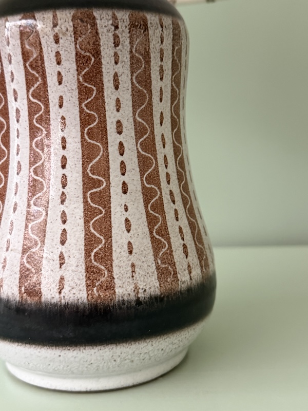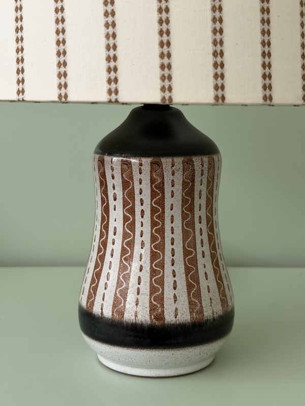 Flot bordlampe i lyse, beige og mørke toner - God størrelse, der kan placeres de fleste steder - Lampen er usigneret men sansynligvis dansk. Her vist med en af vores håndlavede lampeskærme fra eget værksted i Helsingør. Kan tilkøbes.
