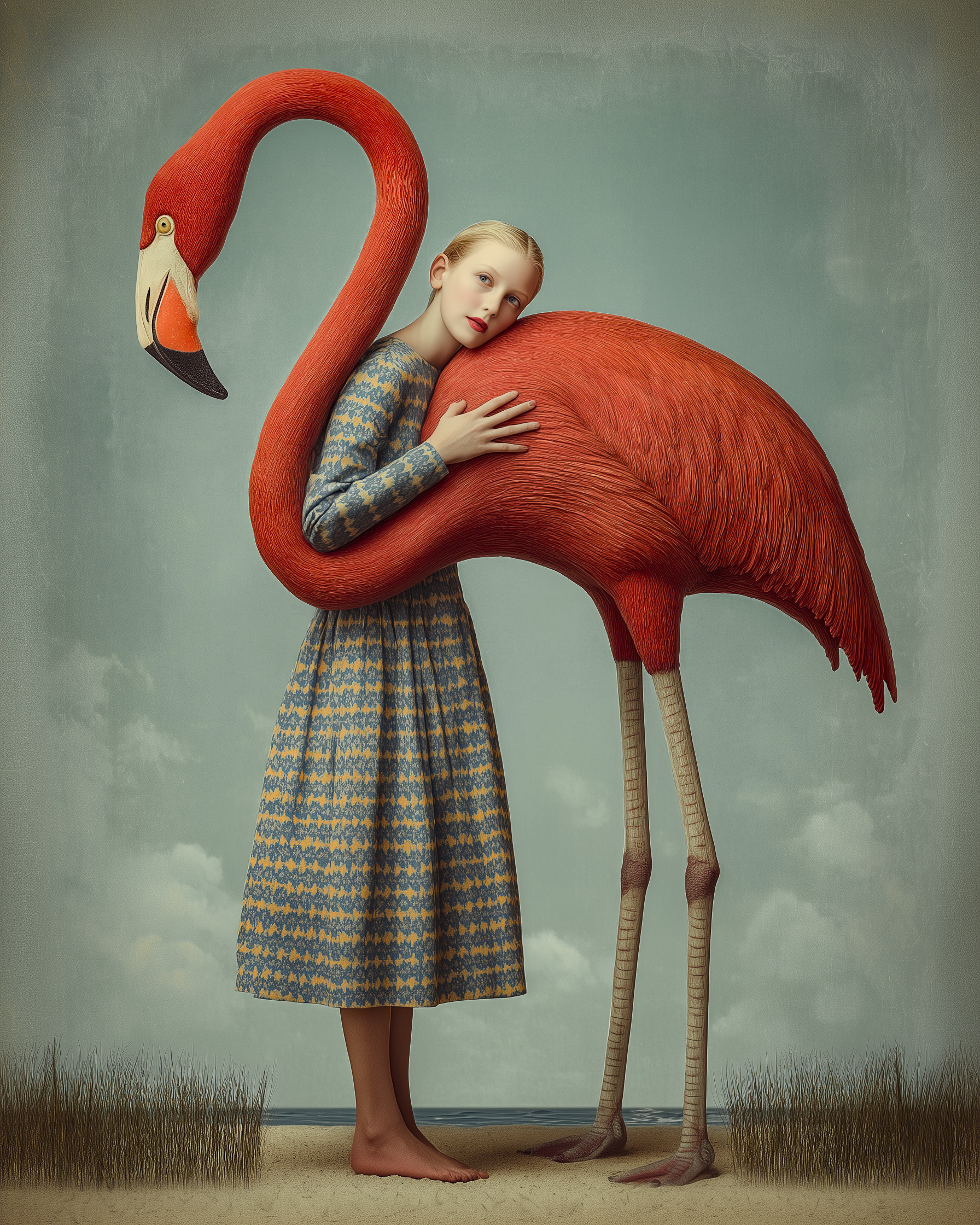 “Dreaming with Flamingo” er et poetisk og drømmende kunstprint skabt af Inge Schuster. Motivet viser en ung person i et stille, magisk øjeblik med en flamingo – et møde mellem ro, skønhed og fantasi. De bløde farver, den maleriske tekstur og den surrealistiske stemning gør værket til et stærkt visuelt statement i ethvert rum.
