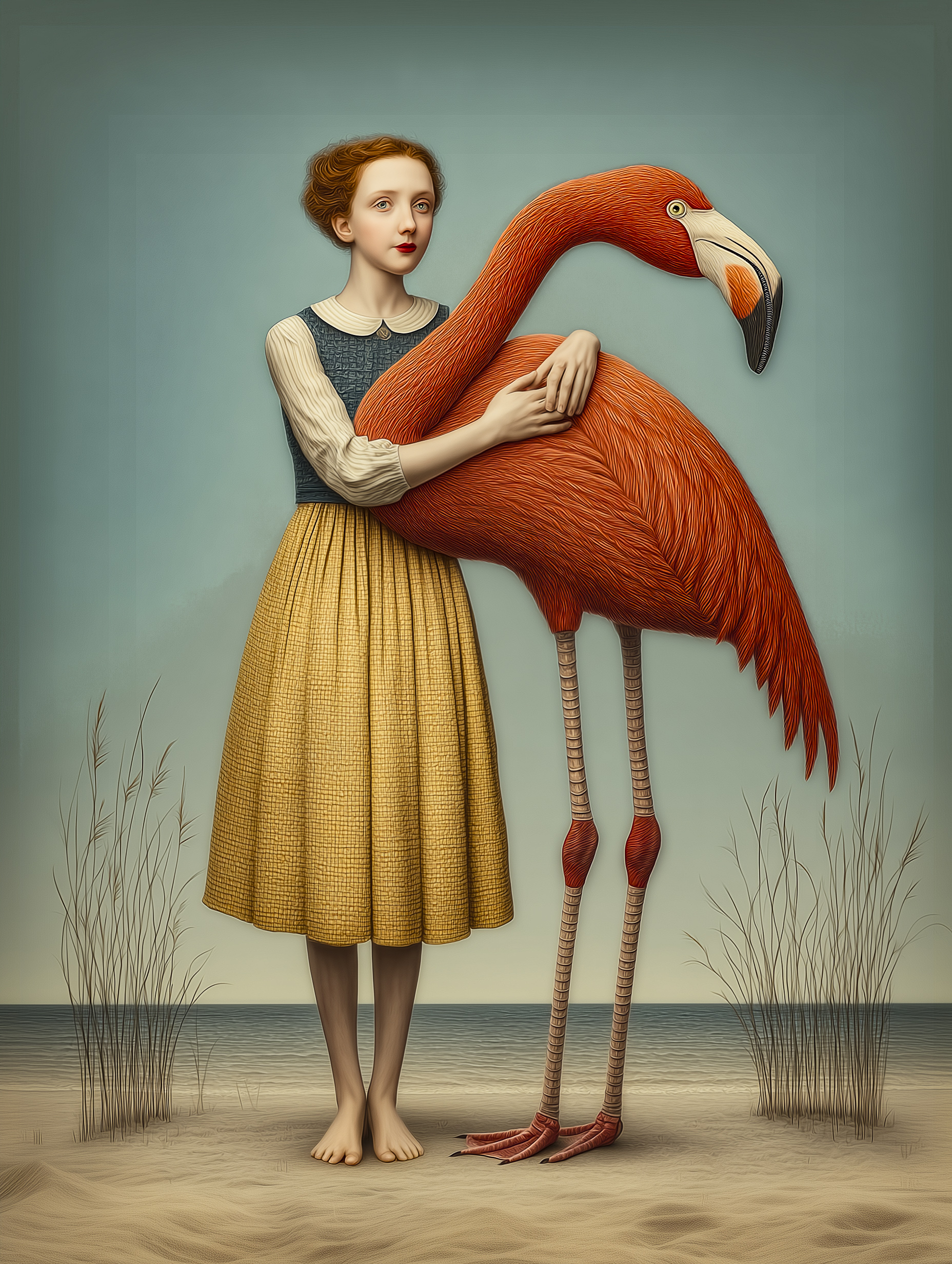 “Crimson” er et stemningsfuldt og drømmende kunstprint af Inge Schuster, hvor en skikkelse står barfodet i sandet og holder en intens rød flamingo tæt ind til kroppen. Motivet rummer både ro, nærvær og et strejf af surrealistisk magi, forstærket af de maleriske detaljer og den harmoniske farvepalette. Et poetisk værk, der skaber et stærkt visuelt fokuspunkt i både moderne og klassiske omgivelser.