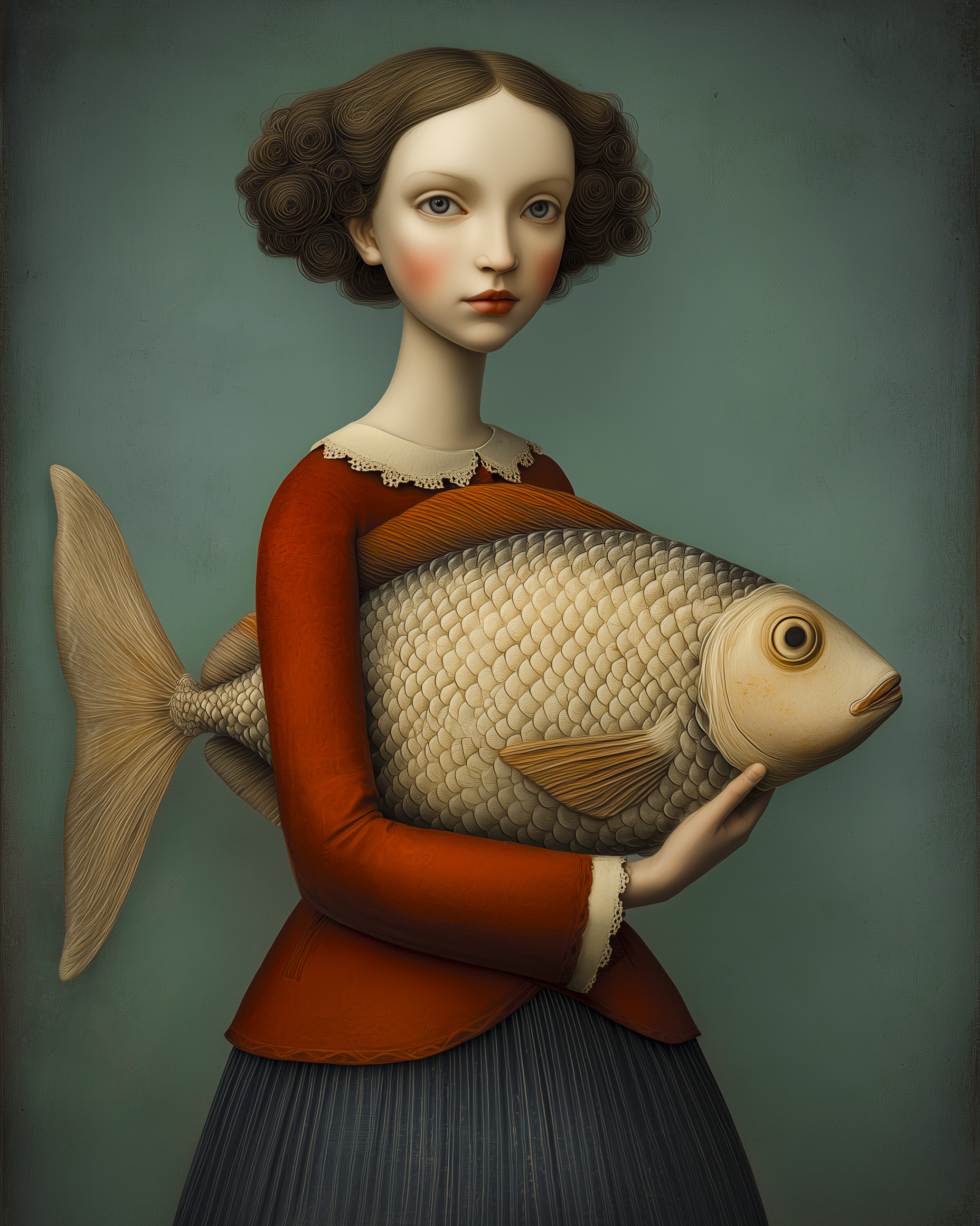“Golden Catch” er et særegent og stemningsmættet kunstprint af Inge Schuster. Motivet viser en rolig, nærmest majestætisk figur, der holder en stor gylden fisk tæt ind til kroppen. De bløde farver, den klassiske komposition og den detaljerede, nærmest skulpturelle tekstur skaber et kunstværk, der både virker tidløst og drømmende. Et visuelt stærkt motiv, der inviterer til fordybelse og tolkning.