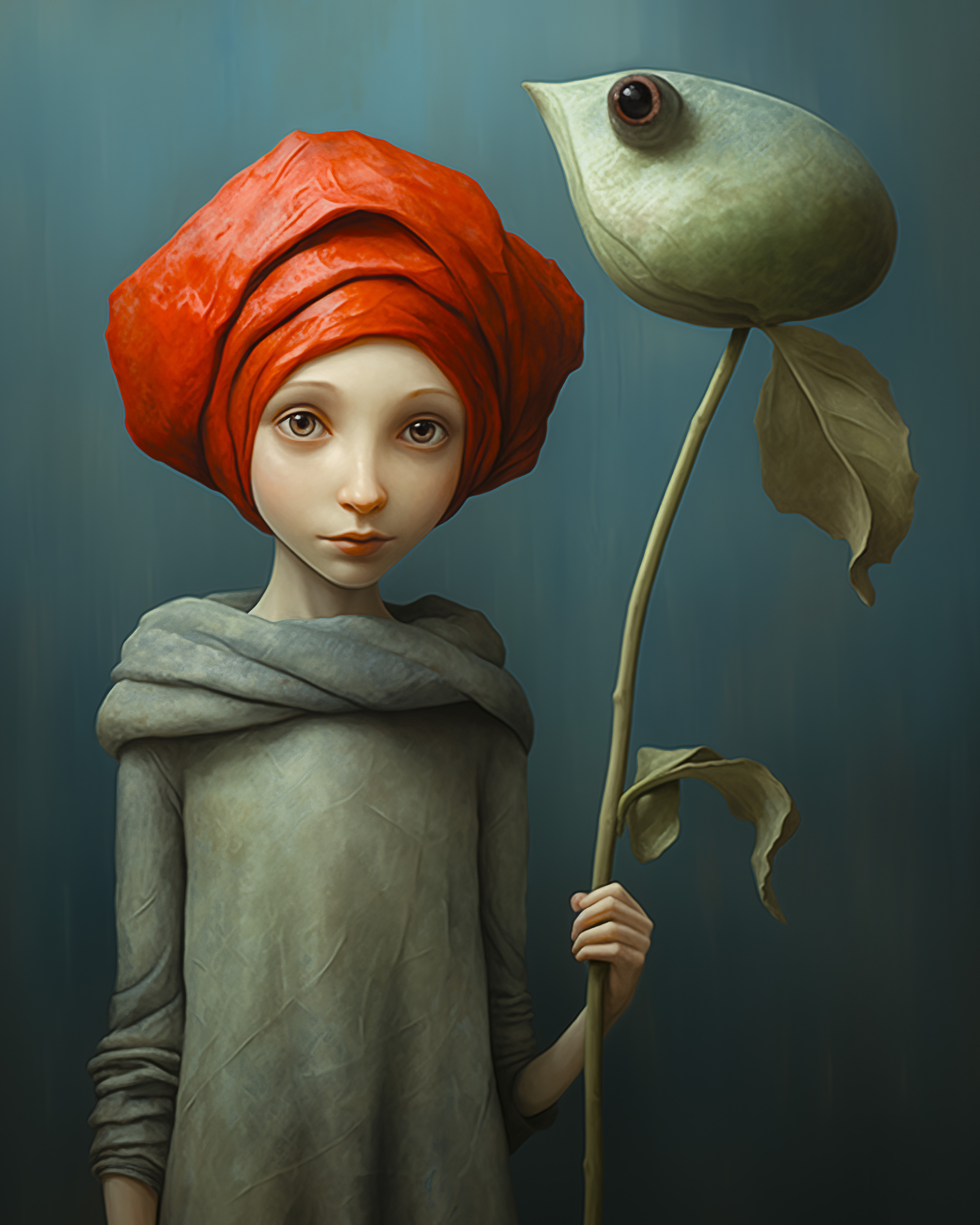 “Looking” er et poetisk og drømmende kunstprint af Inge Schuster. Motivet viser en stille figur med et intenst blik, iført en blød, tekstureret dragt og en markant rød hovedbeklædning. I hånden holder hun en surrealistisk blomsterstilk med et øjeformet knop, der giver værket et mystisk, fantasifuldt og næsten eventyrligt præg. Den maleriske tekstur og den harmoniske farvepalette skaber en visuel fortælling, der både er sart, symbolsk og dragende.
