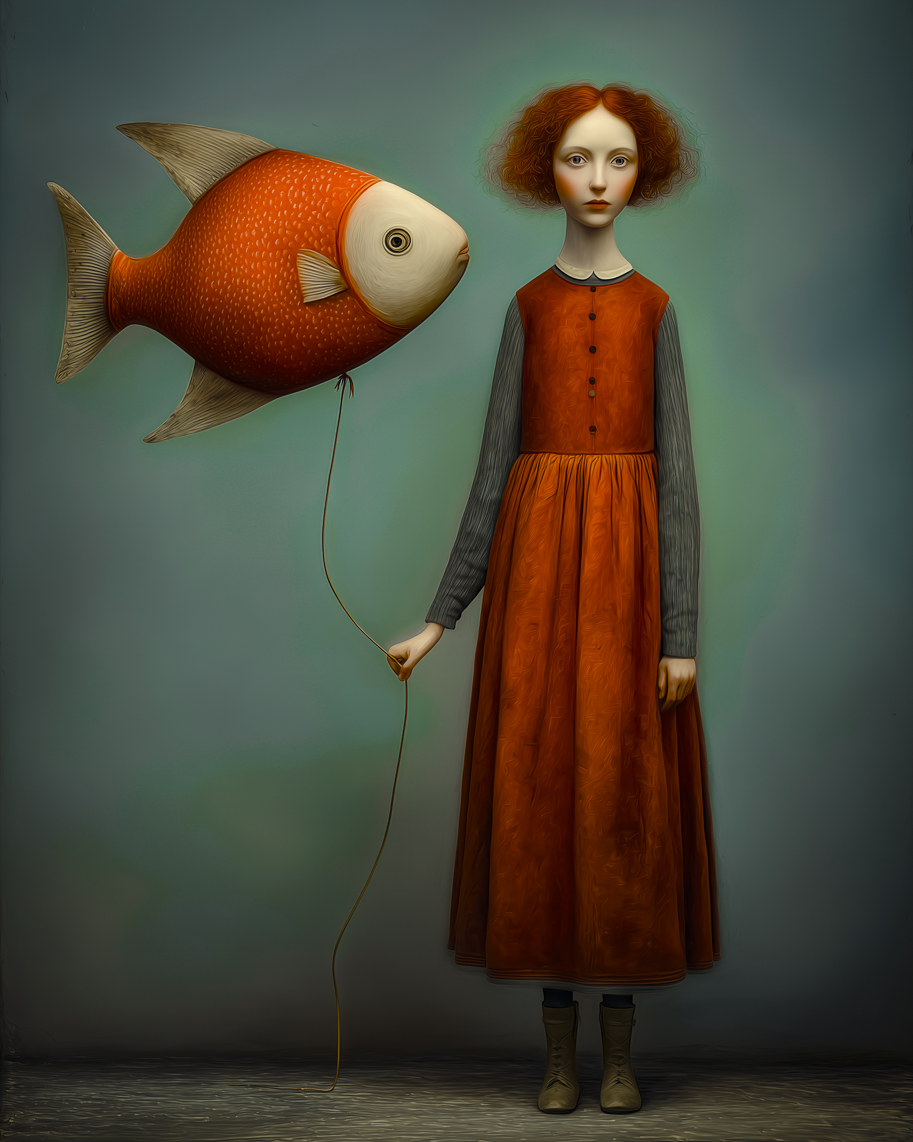 “The Red Fish” er et drømmende og visuelt slående kunstprint af Inge Schuster. Motivet viser en rolig figur i en lang rød kjole, der holder en surrealistisk ballonformet fisk i en tynd snor. Den poetiske komposition, de dybe farver og den maleriske struktur skaber et værk, der balancerer mellem fantasi, symbolik og stille eftertænksomhed. Et kunstprint, der tilføjer både karakter og mystik til enhver væg.