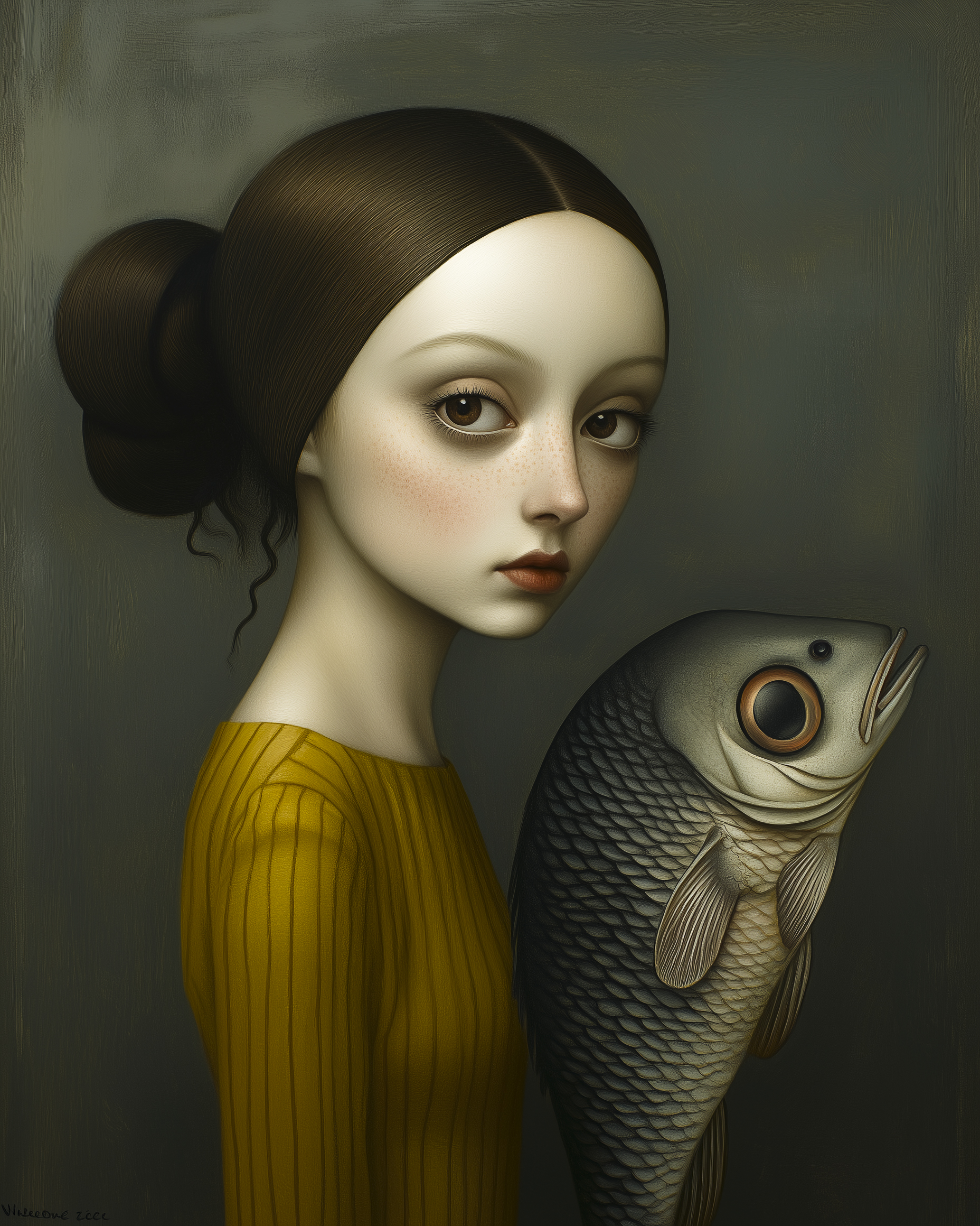 “Keeper of the Silver Fish” er et stemningsfuldt og dragende kunstprint af Inge Schuster. Motivet viser en rolig, elegant figur med et intenst, nærværende blik, mens hun holder en sølvskinnende fisk tæt ind til kroppen. Det afdæmpede farveunivers, de fine teksturer og den klassiske komposition giver værket en næsten ikonisk kvalitet – tidløst, mystisk og dybt poetisk.