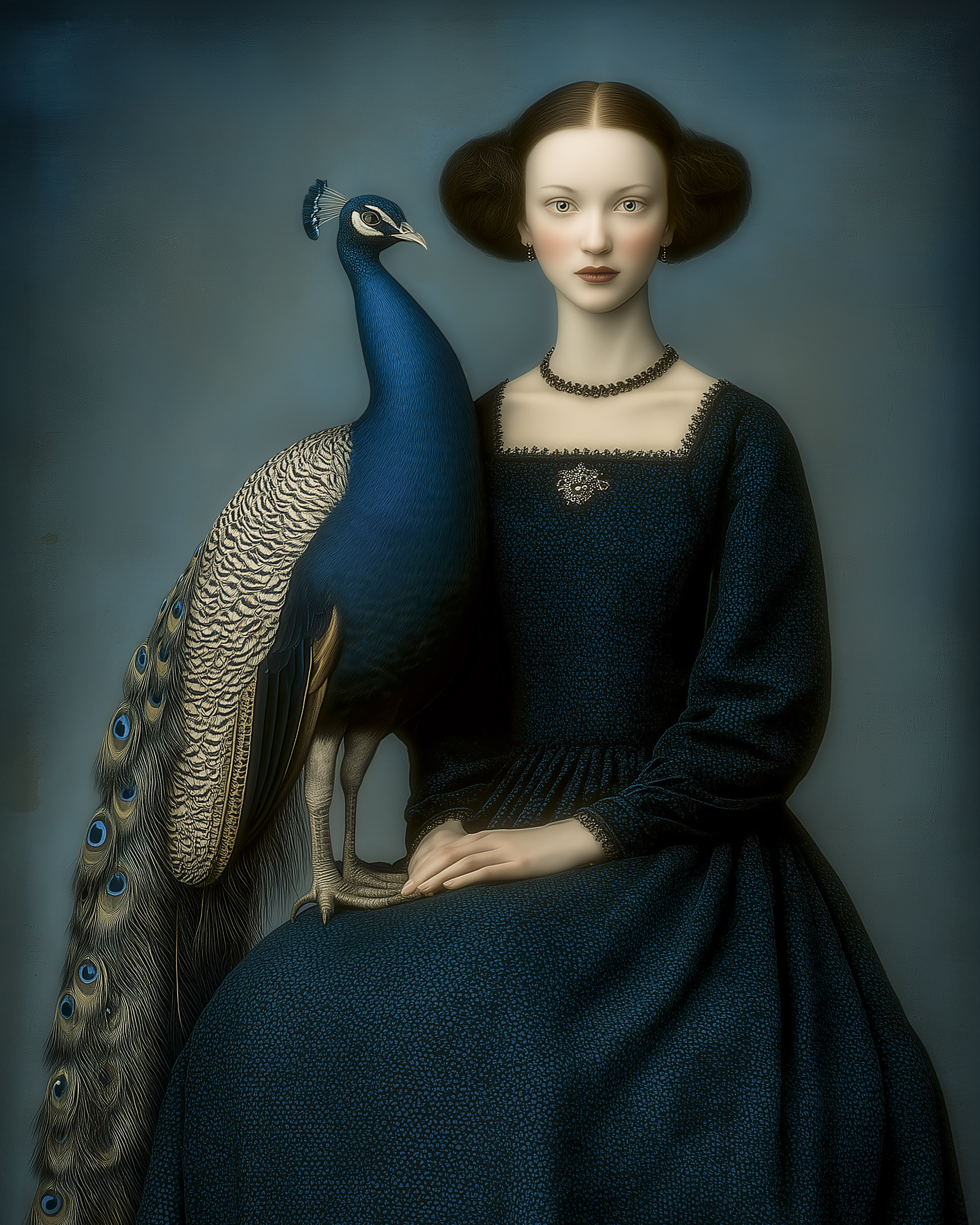 “Lady of the Peacock” er et storslået og atmosfærisk kunstprint af Inge Schuster. Motivet viser en rolig, næsten regal skikkelse i dyb blå kjole, ledsaget af en majestætisk påfugl. De rige blå nuancer, den maleriske tekstur og den klassiske, næsten portrætmaleriske komposition skaber et værk, der fremstår både tidløst, elegant og magisk. Et visuelt stærkt statement-piece, der tilfører rummet en følelse af ro, skønhed og mystik.