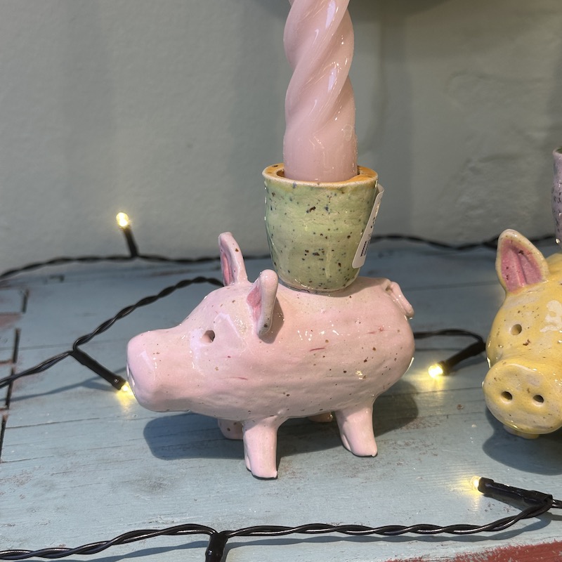 Keramik lysestage - Håndlavet gris i lyserød glasur