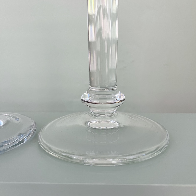Smukke vintage lysestager i klart glas, skabt i et elegant og tidløst design. De har en klassisk opbygning med rund fod, markerede detaljer på skaftet og en bred top, der giver et eksklusivt og harmonisk udtryk.