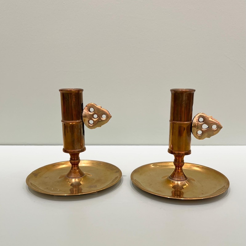 Smuk vintage kammerstage i messing med klassisk skålformet bund og et fint, dekorativt håndtag. Denne model er udstyret med en traditionel justerskrue, som gør det muligt at løfte lyset op, efterhånden som det brænder ned – en charmerende og autentisk detalje fra gamle tiders håndværk.