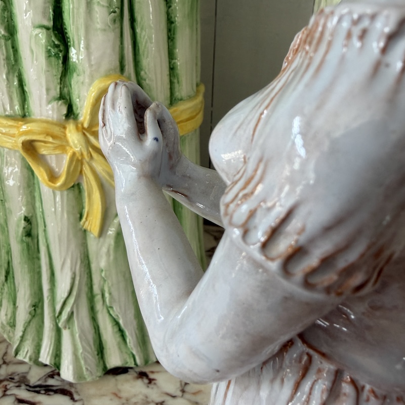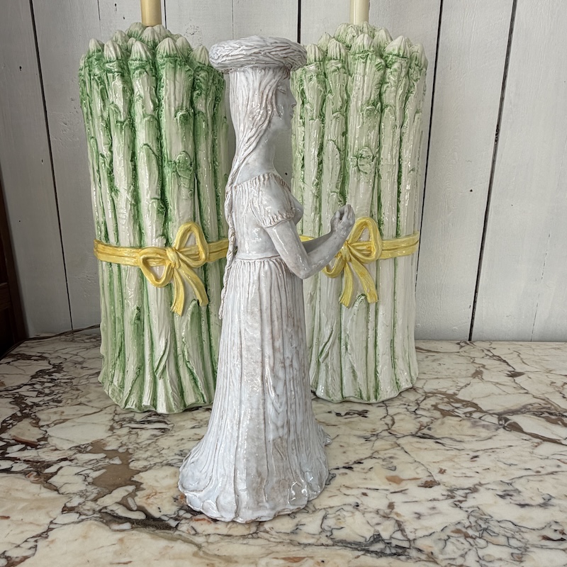 Denne har vi ledt efter i 8 år - Hun er fantastisk - Der er plads til 4 tynde lys i kransen på hovedet. Hun er håndlavet i keramik - Signeret men signaturen er ukendt. Flot udført og flot stand. Dog med en flig, der er limet på i krandsen, men det er fint lavet og jeg så det ikke i første omgang. I midten af kransen er der en fordybning, hvor der kan placeres lidt mos eller måske et større lys.