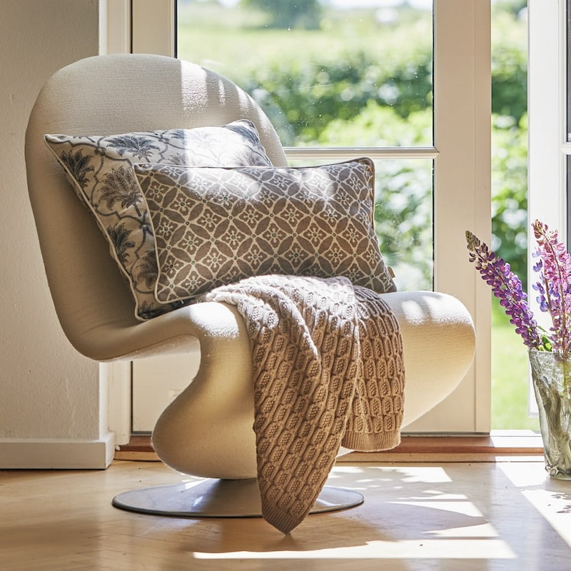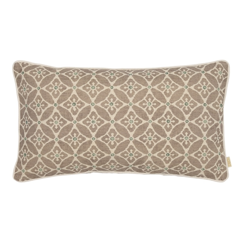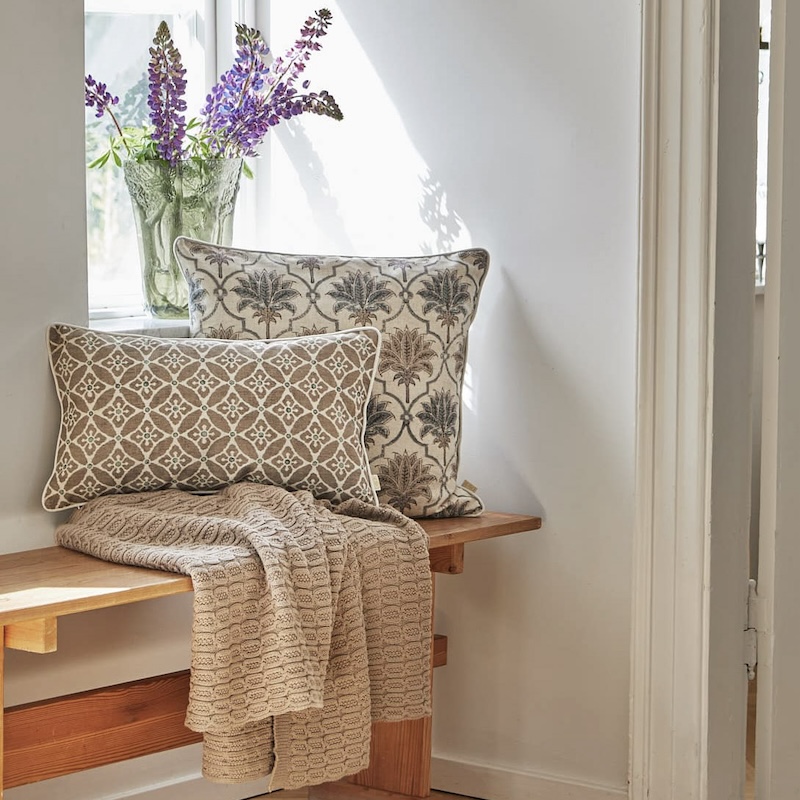 Marita er en smuk og tidløs pude med et klassisk mønster i varme, dæmpede latte-toner og små detaljer i støvet grøn. Stoffet er vævet i en slidstærk og blød blanding af 85% bomuld og 15% hør og er Oeko-Tex certificeret.