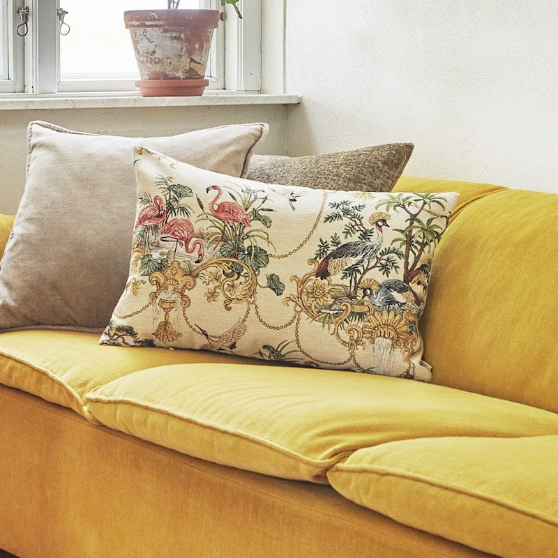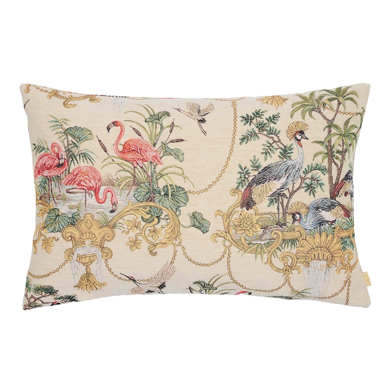 Flamingo er en dekorativ gobelinpude med et eksotisk motiv af flamingoer, traner og palmer i et elegant, detaljerigt design. Farvepaletten kombinerer varme beige- og sandtoner med grønne, pink og gyldne nuancer, hvilket gør puden til et kunstnerisk indslag i enhver indretning. Stoffet er tæt vævet i en slidstærk og Oeko-Tex certificeret kvalitet af bomuld, polyester og polyakryl.