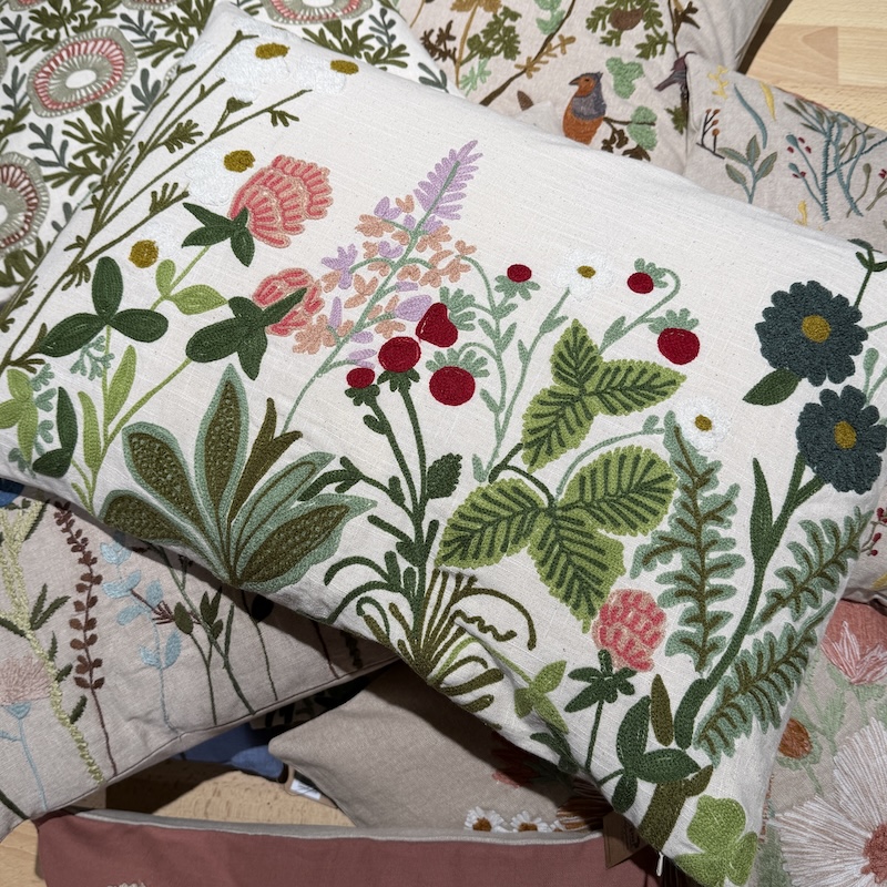 Skab en hyggelig stemning med de mange smukke puder med broderede blomster fra miljögården. Kombiner på kryds og tværs og få en stemning af hygge og sommer på terrassen, i stuen eller i ynglingsstolen.