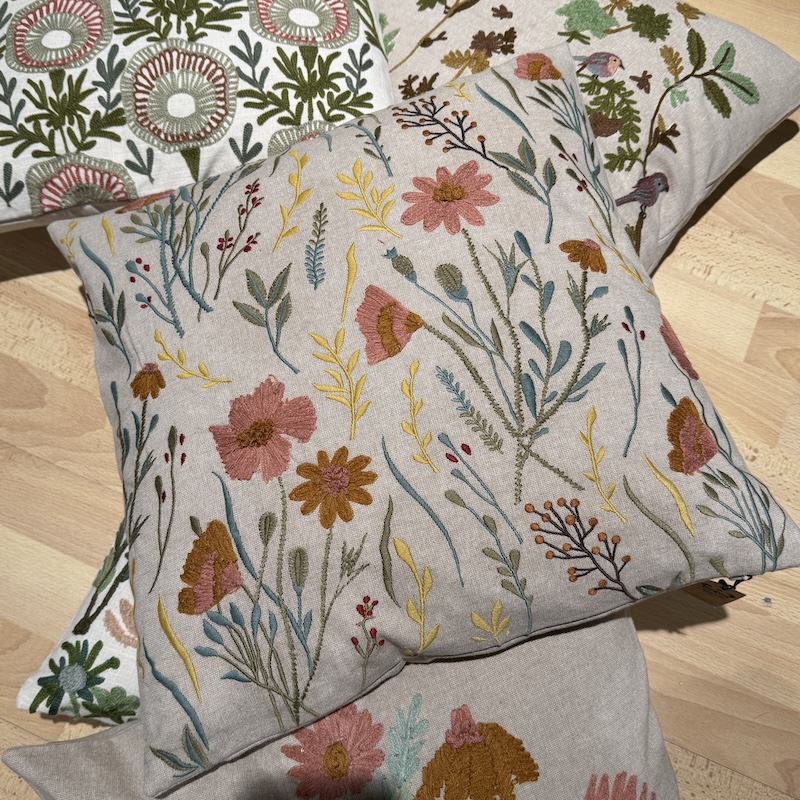 Skab en hyggelig stemning med de mange smukke puder med broderede blomster fra miljögården. Kombiner på kryds og tværs og få en stemning af hygge og sommer på terrassen, i stuen eller i ynglingsstolen.