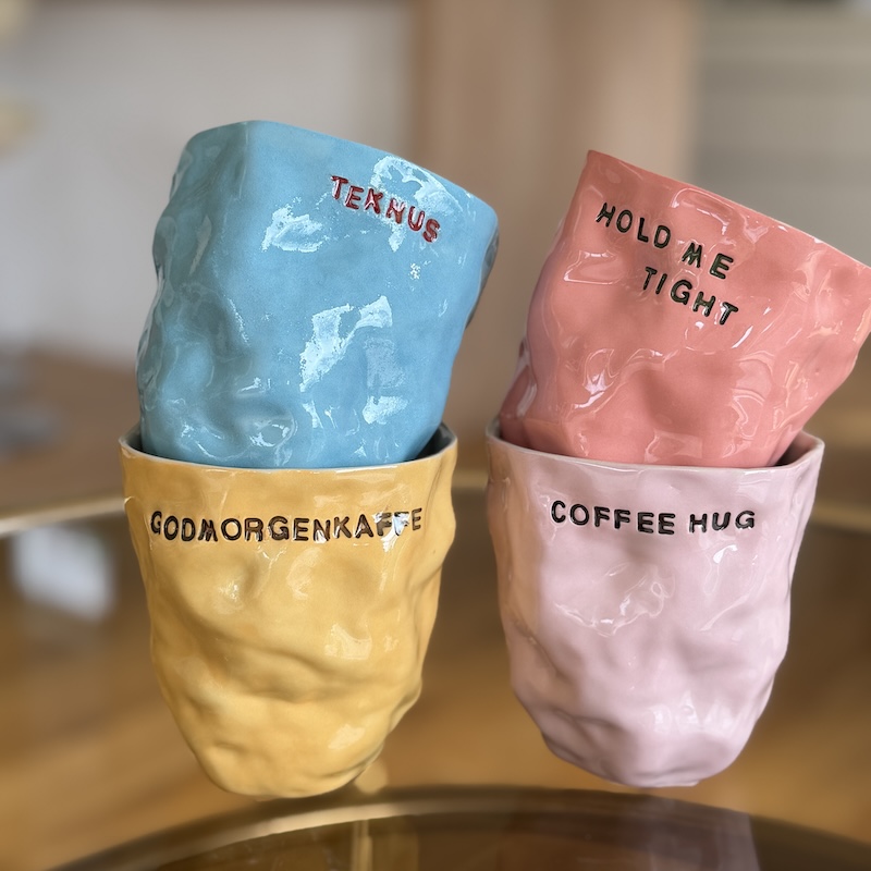 Andrea G's skønne krøllekopper med finurlig tekst. Koppen ligger godt i hånden og passer perfekt til en stor kop kaffe - Der kan selvfølgelig også drikkes andet af koppen :-) De er alle forskellige så nup din yndlingskop, når du ser den, da der ikke er garanti for at samme kop bliver lavet igen.
