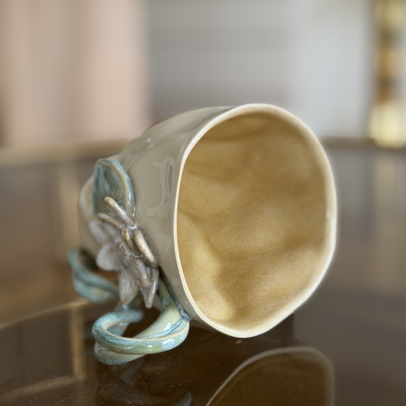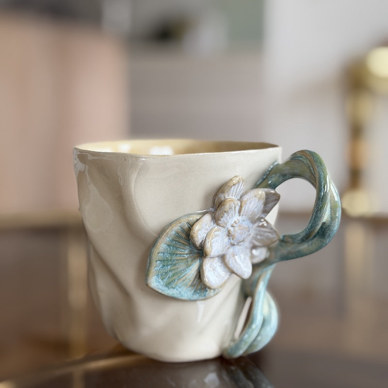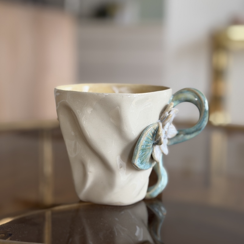 Kopserien fra Andrea Grandelag er smukke krøllekopper, der er dekoreret med de mest eventyrlige blomster - Alle blomster er lavet i hånden og ikke udstukket, hvilket gør hver enkelt kop helt unik. De smukke formede hanke, der udgør blomstens stilk giver en legende lethed og et drømmende udtryk - Kopperne er udsøgte og keramikkunst fra øverste hylde.