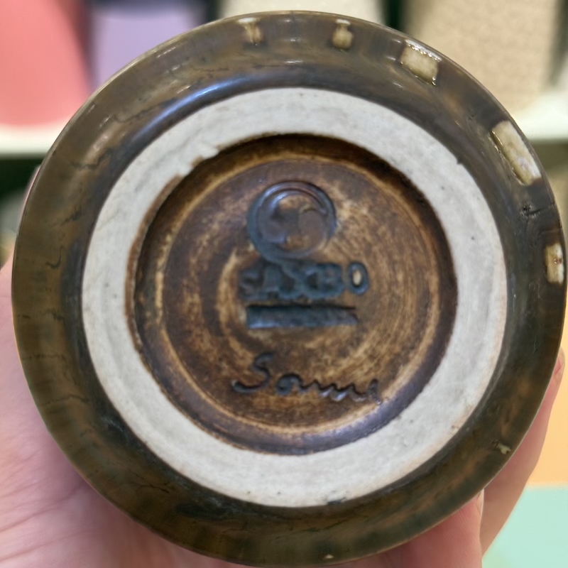Elegant vintage vase fra Saxbo, signeret af Edith Sonne. Vasen har en klassisk, slank form og en smuk brun glasur med diskret vertikal struktur, som giver den dybde og varme. Den enkle silhuet og den sofistikerede glasur gør vasen både tidløs og dekorativ – perfekt som samlerobjekt eller som et stilrent element i moderne indretning.
