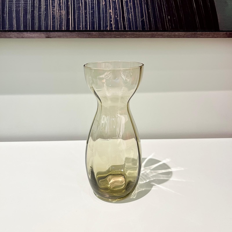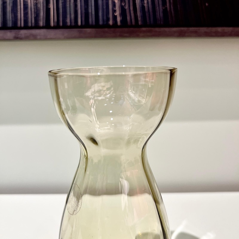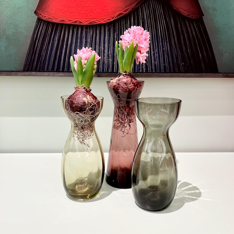 Smuk vintage hyacintvase i en let, lys grøn tone, der giver et blødt og elegant udtryk. Den klassiske timeglasform gør den ideel til at dyrke hyacinter i vand, hvor både løg og rødder kommer smukt til syne gennem det transparente glas.