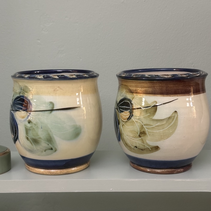Gamle charmerende urtepotter der også vil fungere fint som vaser - Smukt dekoreret med blomster der falder lidt forskelligt ud på vaserne i farverne, hvilket blot understreger det håndlavede element.
