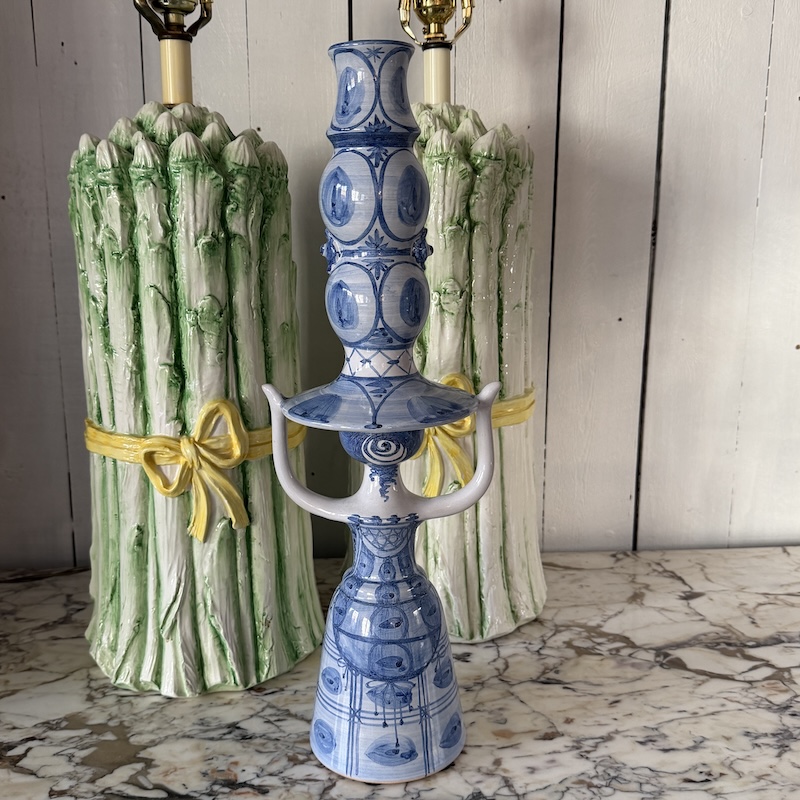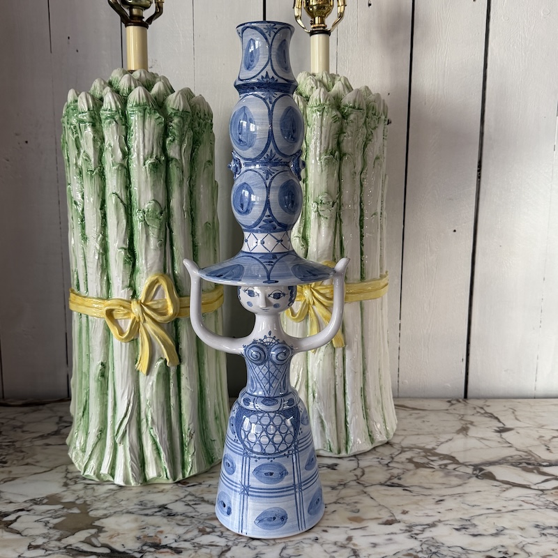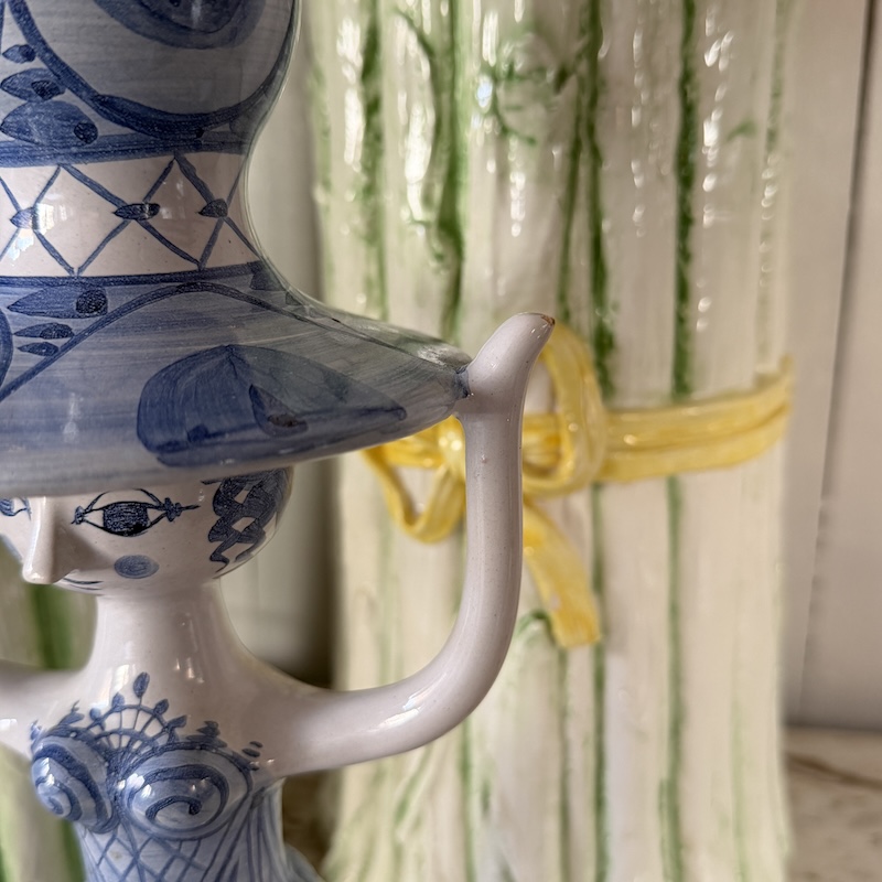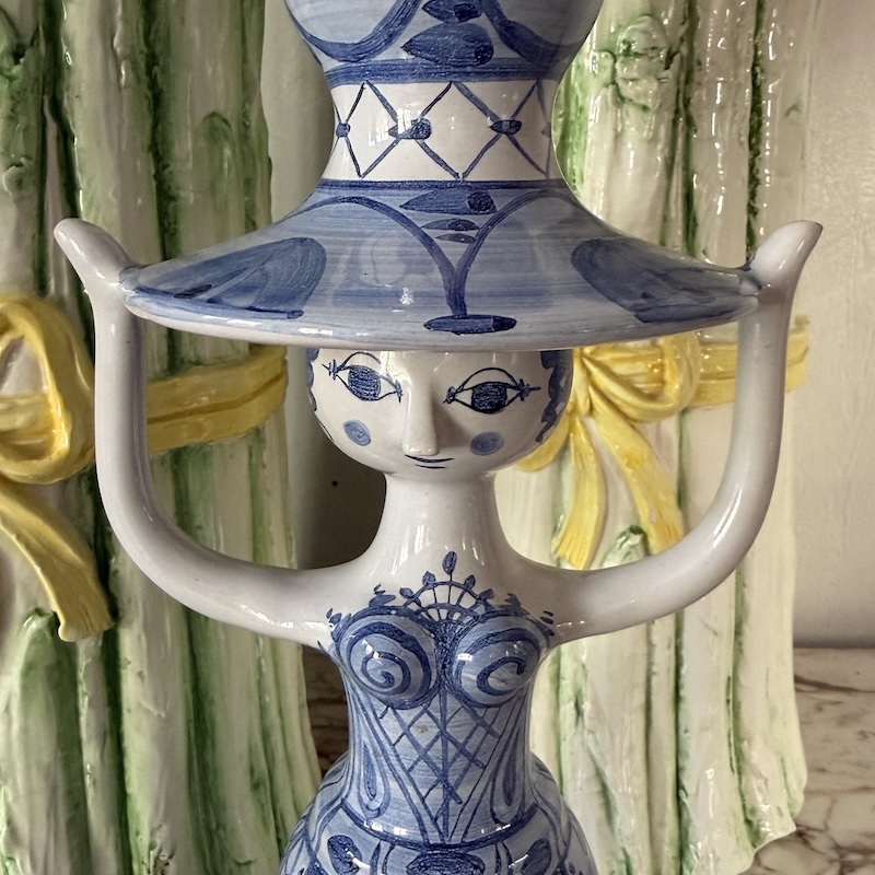 Smuk stor lysestage af Bjørn Wiinblad - Klassisk og elskelig kande, der nok mest bruges som vase - Denne fremstår i meget flot stand (micro glasur afslag på den ene hånd - se foto) og er lavet i 1989 i de klassiske blå hvide farver.