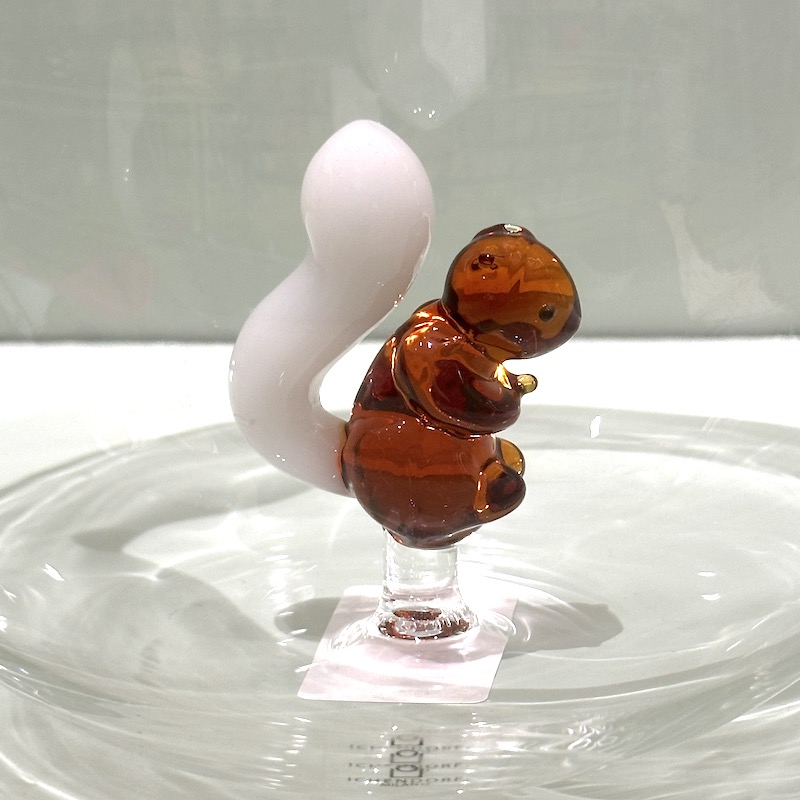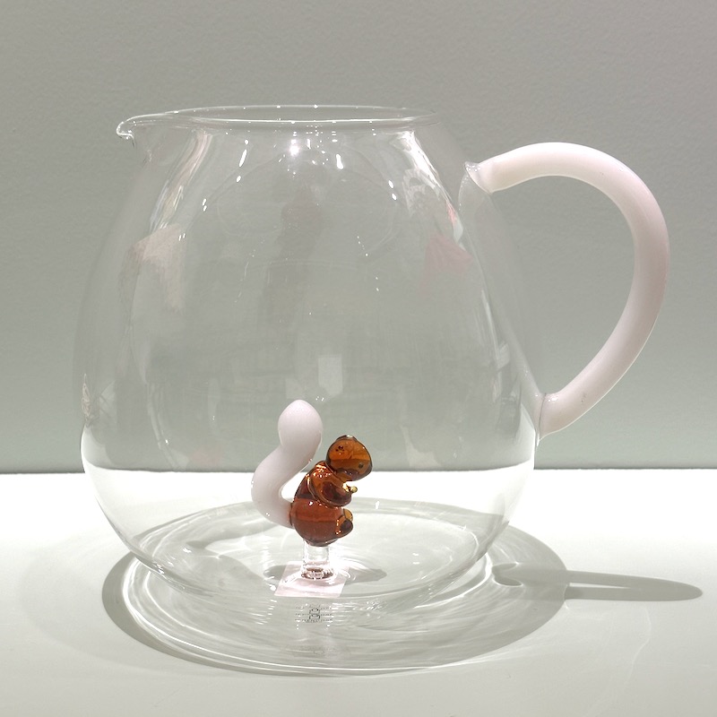 Smuk og humoristisk glaskande med sødt egern i bunden – håndlavet italiensk glas. Kanden kombinerer funktionalitet med finurligt design og bliver hurtigt et samtaleemne ved bordet. Fremstillet i klart glas med hvide og ravfarvede detaljer.