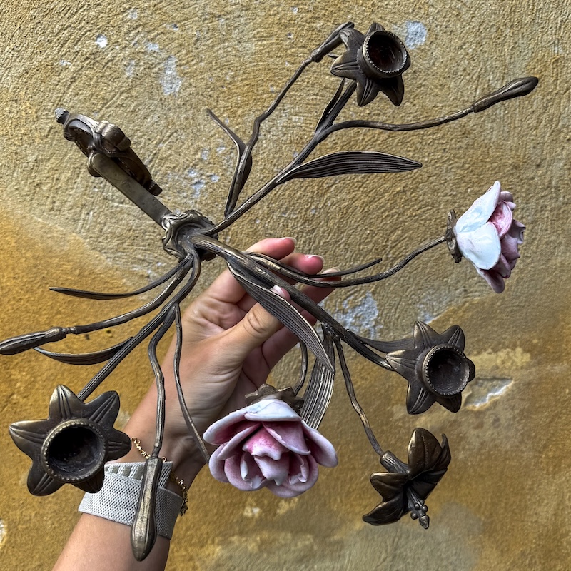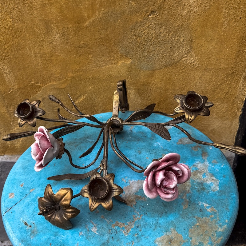Smukke og dekorative vintage vægstager i messing med håndmalede porcelænsroser i rosa nuancer. Designet som blomstrende grene med plads til fire lys, perfekt til at skabe en romantisk og klassisk stemning i hjemmet.