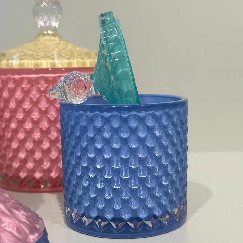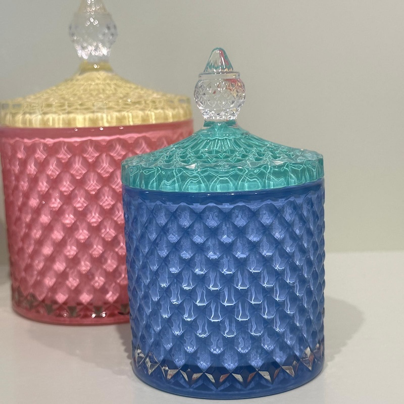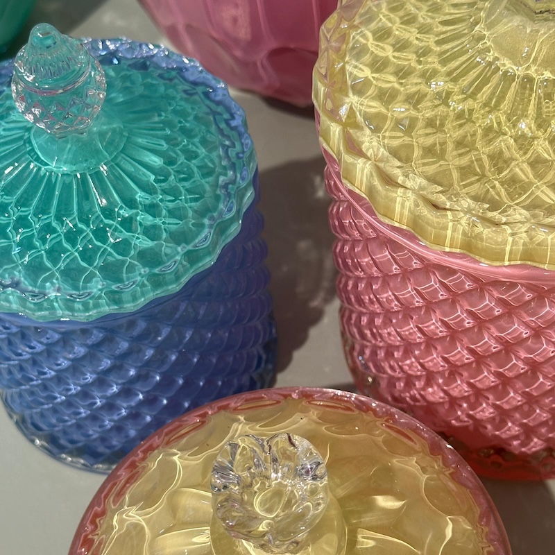 Yndig bonbonniere i glas med lyseblå skål og lysegrønt låg
