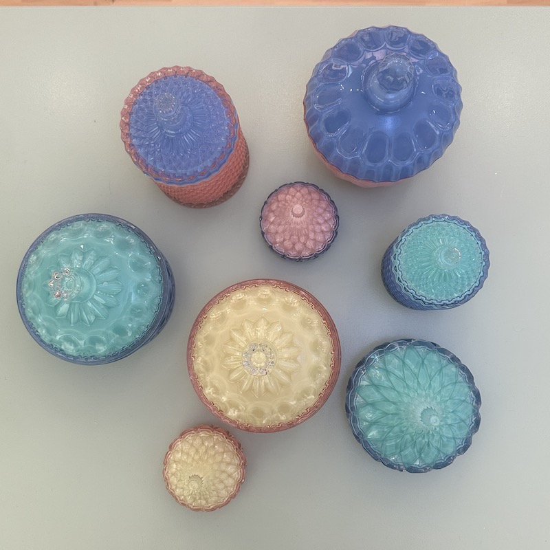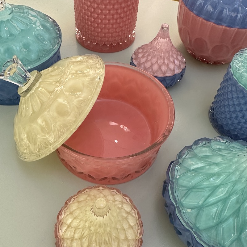 Lille bonbonniere i farvet glas med pink bund og låg i en varm gul nuance. Den dekorative, strukturerede overflade gør den til et charmerende blikfang i ethvert rum. Ideel til opbevaring af småting, slik eller som en unik pyntegenstand.