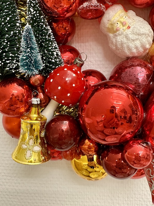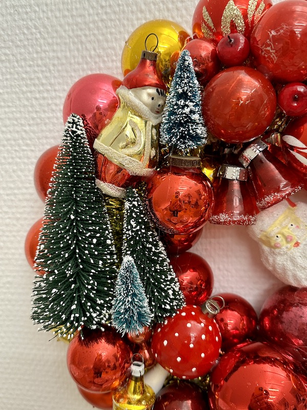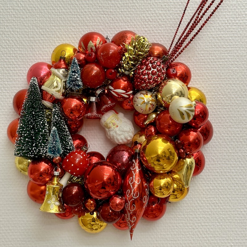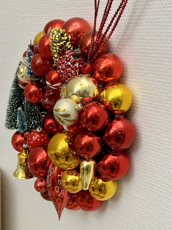 Håndlavet julekrans bestående udelukkende af gamle julekugler - Denne krans oser af gammel jul med sine røde og guldfarvede julekugler.