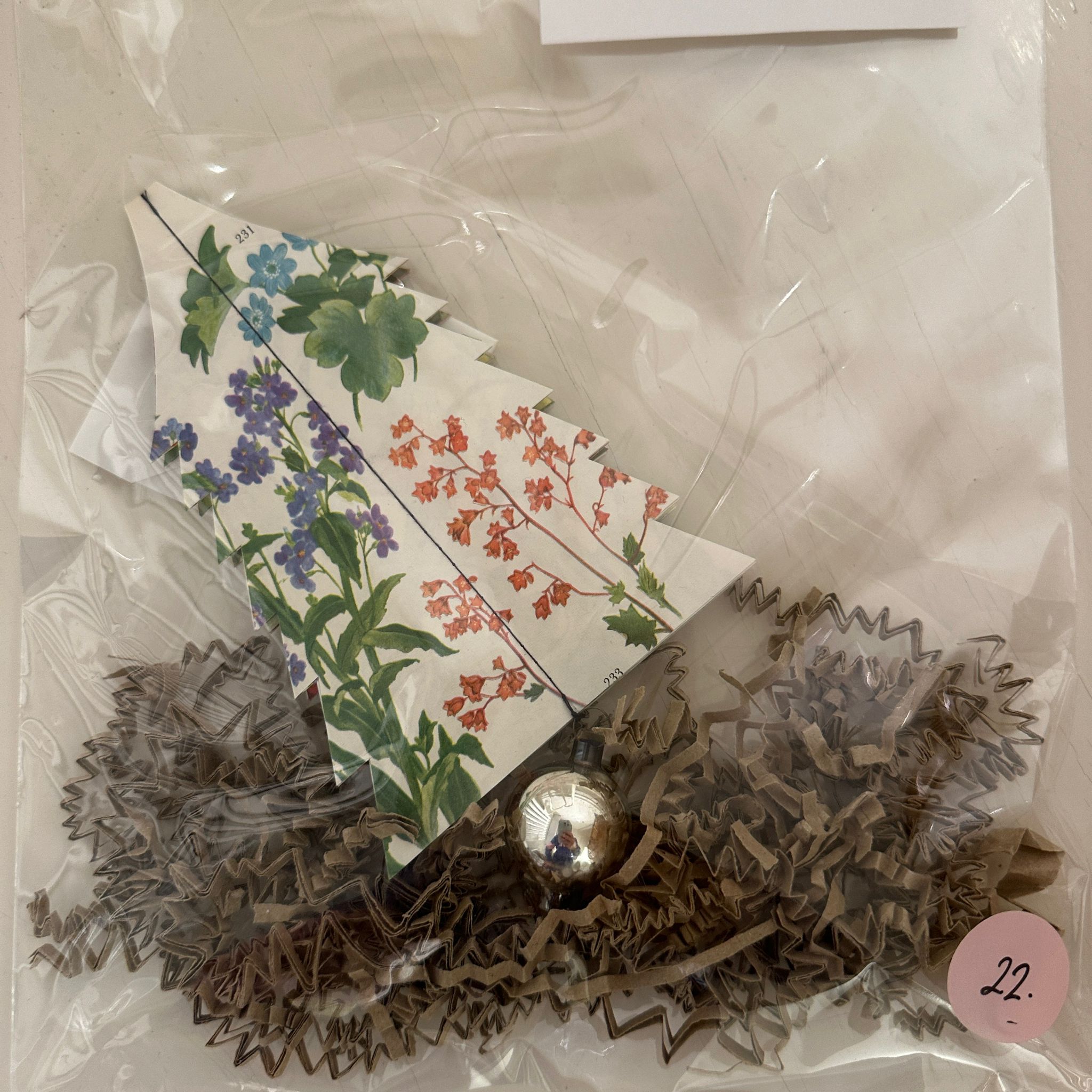 Juletræerne er lavet af gamle flora prints og den fine kugle, der hænger under træet er vintage. Træet er yndigt og fint når det hænger.