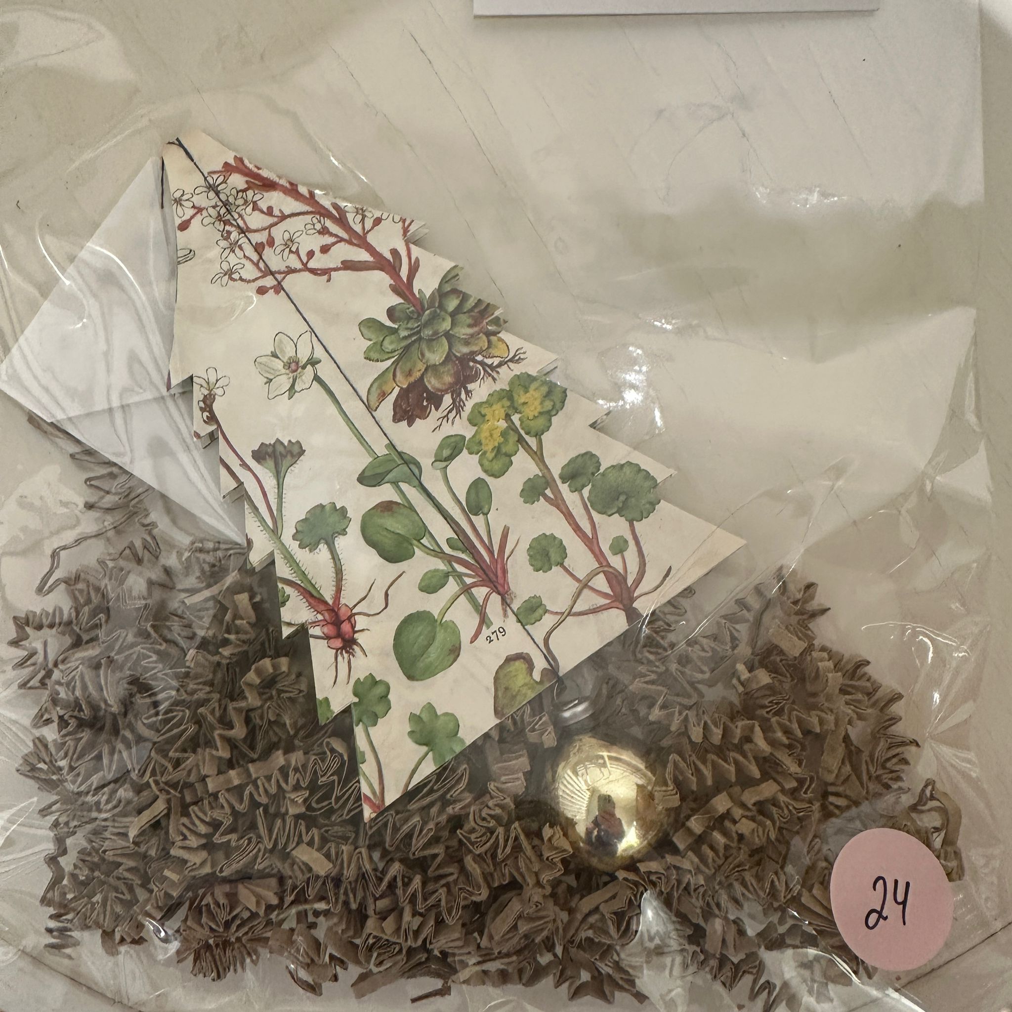 Juletræerne er lavet af gamle flora prints og den fine kugle, der hænger under træet er vintage. Træet er yndigt og fint når det hænger.