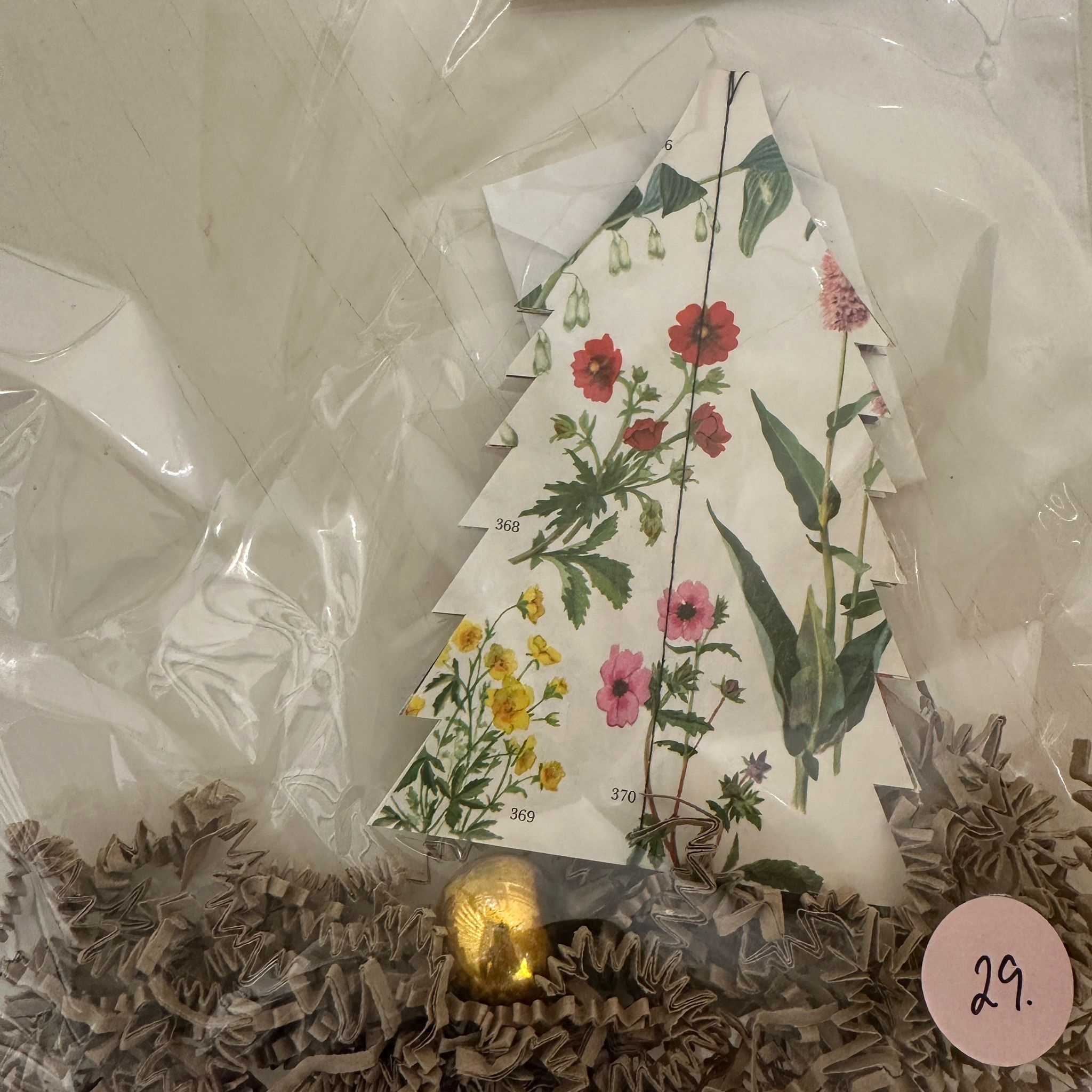 Juletræerne er lavet af gamle flora prints og den fine kugle, der hænger under træet er vintage. Træet er yndigt og fint når det hænger.