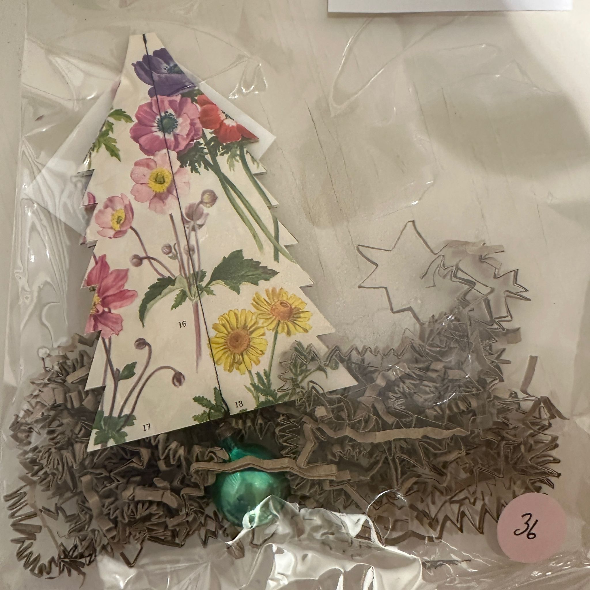 Juletræerne er lavet af gamle flora prints og den fine kugle, der hænger under træet er vintage. Træet er yndigt og fint når det hænger.