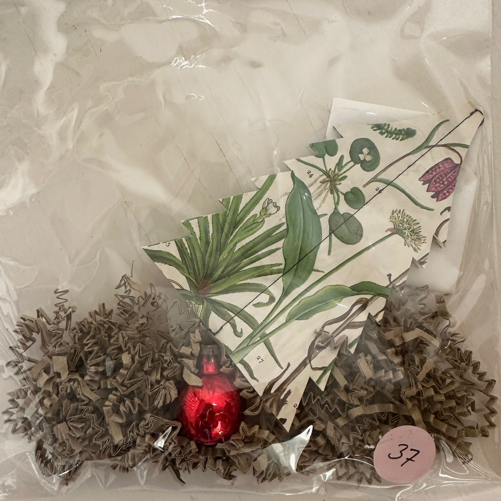 Juletræerne er lavet af gamle flora prints og den fine kugle, der hænger under træet er vintage. Træet er yndigt og fint når det hænger.