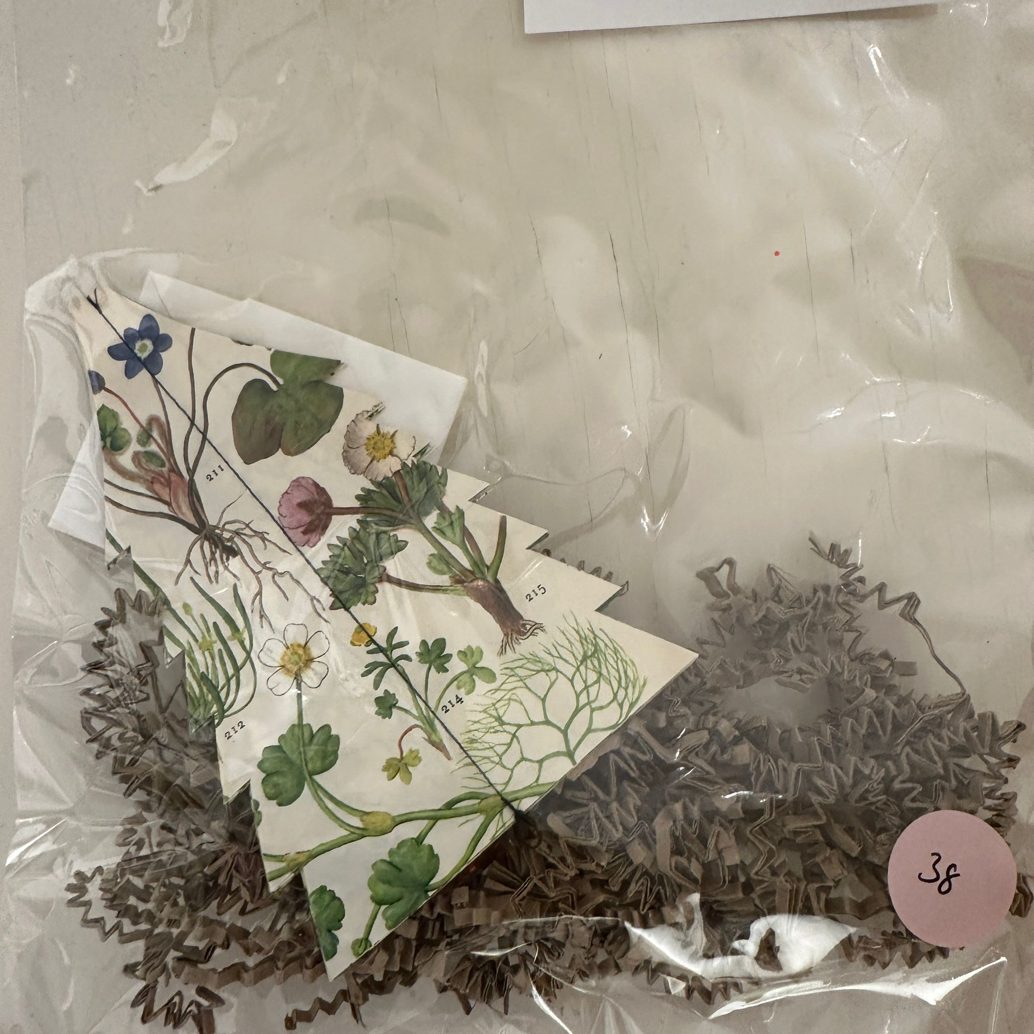 Juletræerne er lavet af gamle flora prints og den fine kugle, der hænger under træet er vintage. Træet er yndigt og fint når det hænger.
