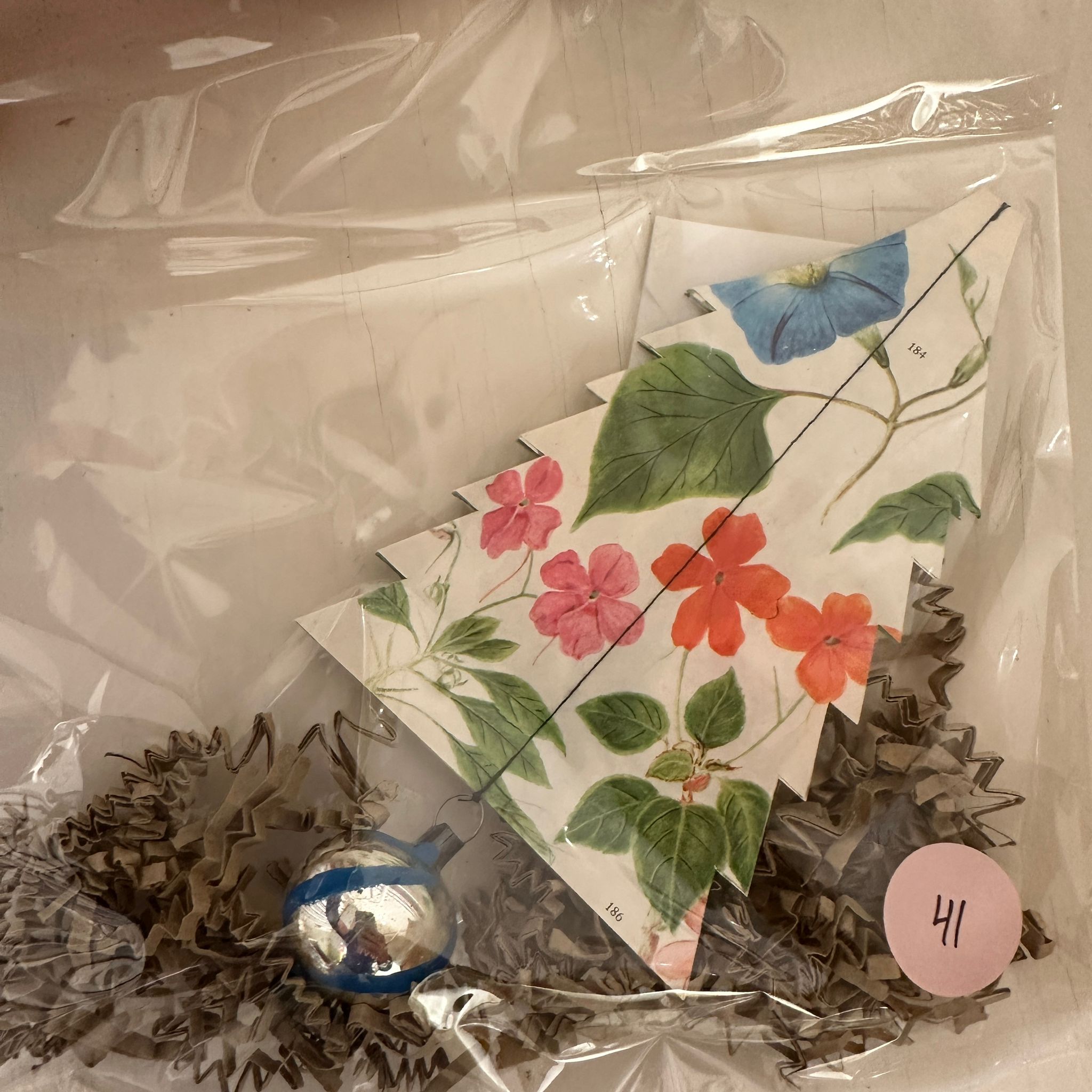 Juletræerne er lavet af gamle flora prints og den fine kugle, der hænger under træet er vintage. Træet er yndigt og fint når det hænger.