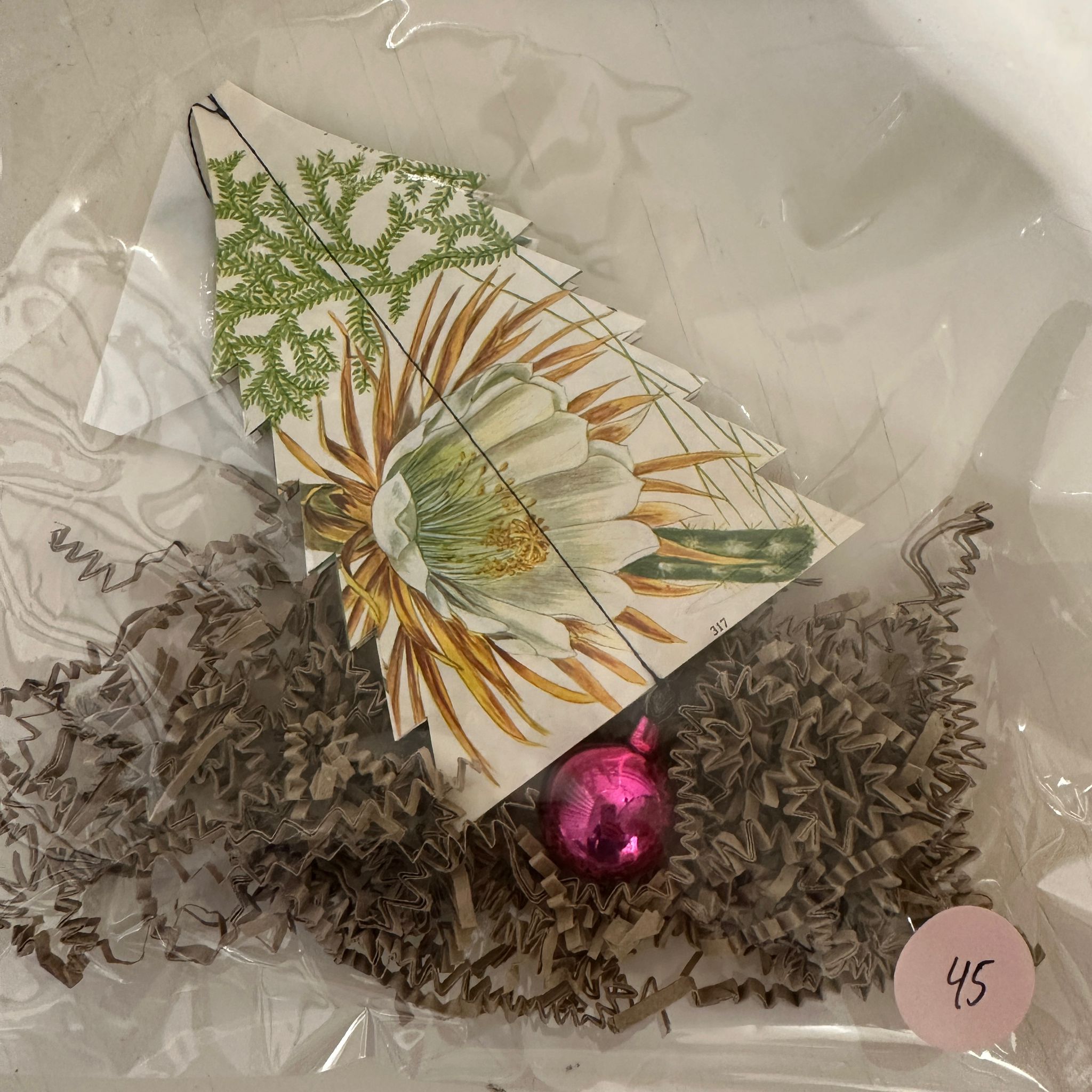 Juletræerne er lavet af gamle flora prints og den fine kugle, der hænger under træet er vintage. Træet er yndigt og fint når det hænger.
