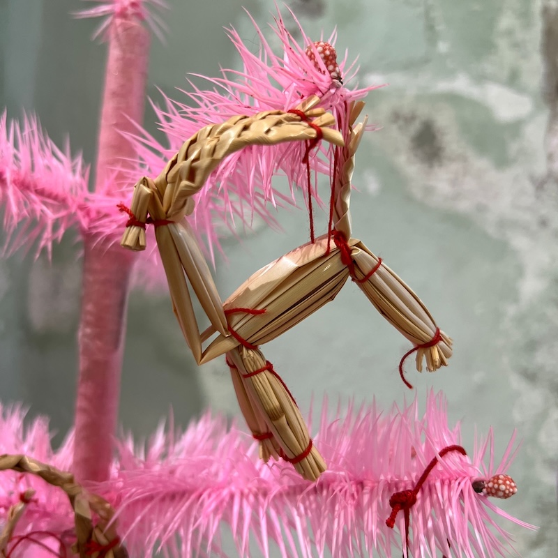 12 stk halm julepynt, julebuk og krans, 6 stk af hver pakket i fin rum inddelt julepyntsæske