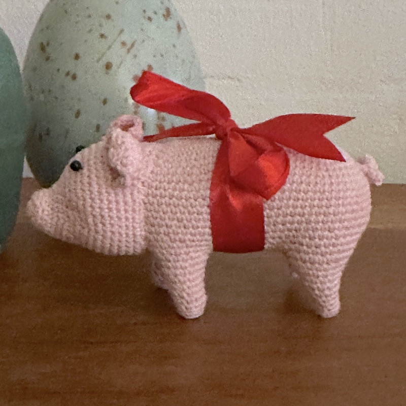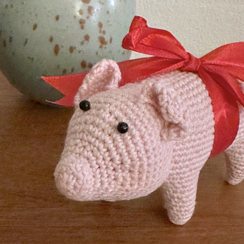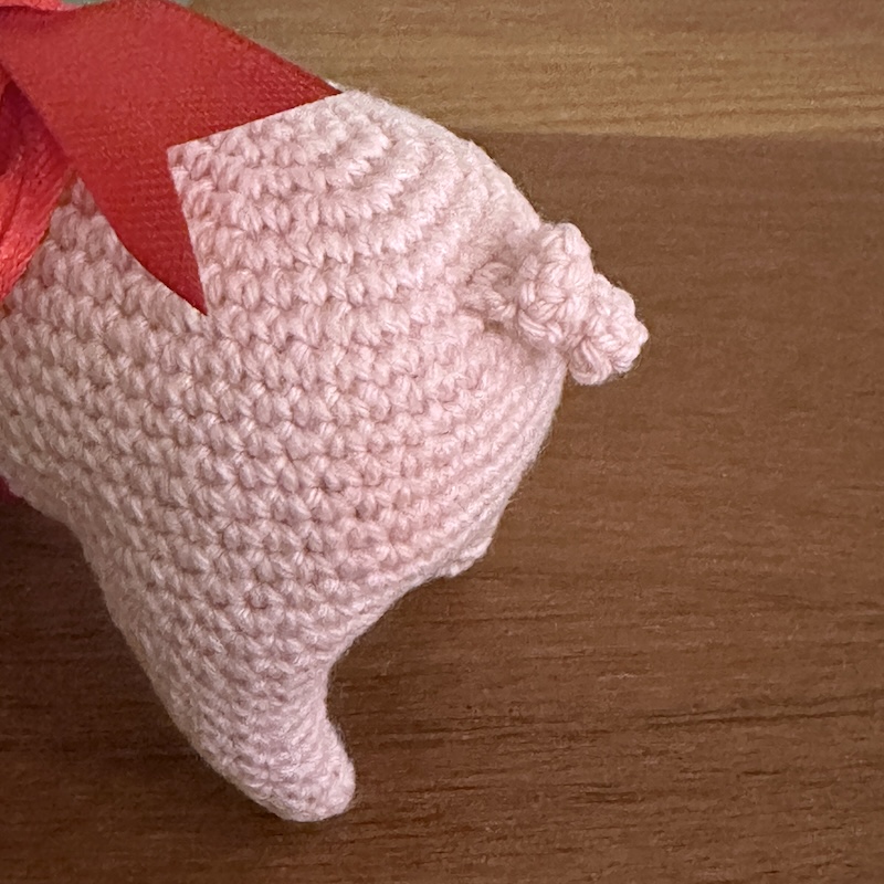 Skøn julegris hæklet i hånden i Danmark. Perfekt som mandelgave og selvfølgelig har den det klassiske røde bånd om maven.
