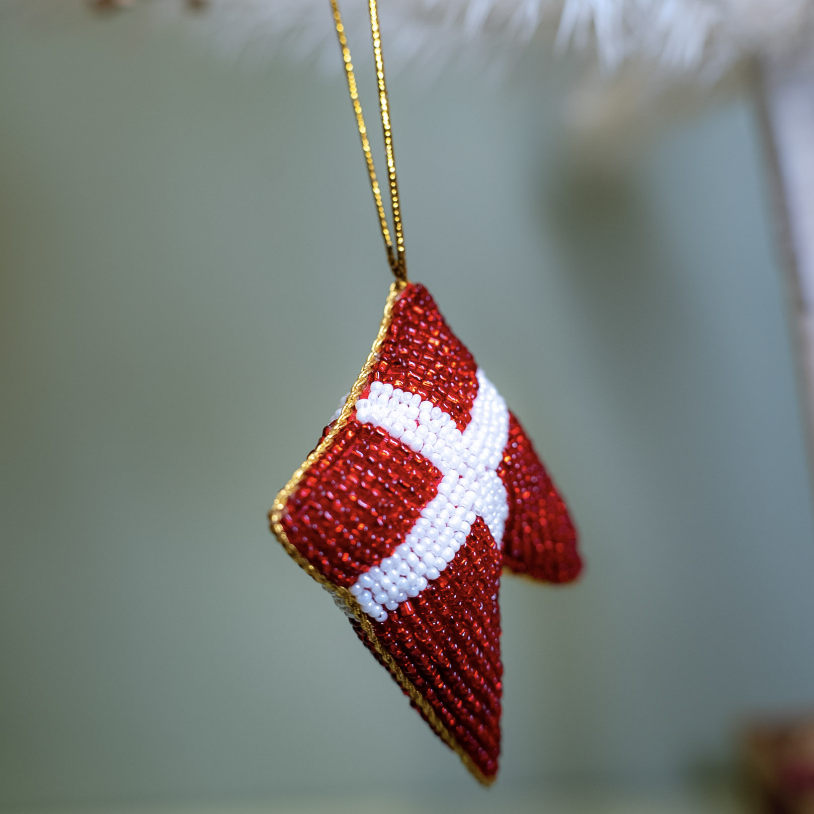 Dannebro hører sig til på juletræet - Her smukt dekoreret med røde og hvide perler.