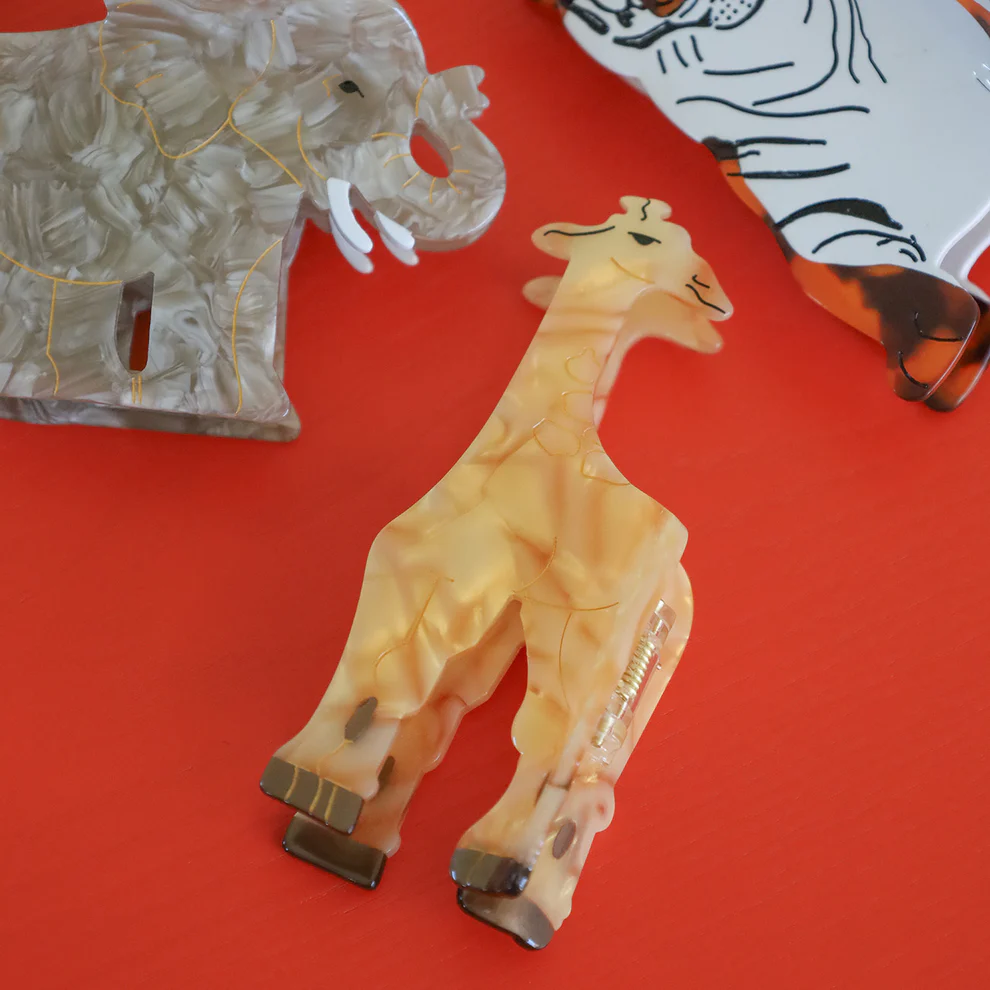 Tilføj et strejf af savannens charme til dit look med denne sjove hårklemme formet som en gylden giraf. Lavet i glansfuld acetat med flotte marmorerede nuancer og detaljer, som gør klemmen både dekorativ og praktisk.
