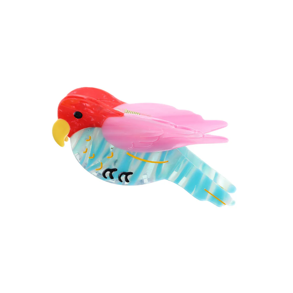 En farverig hårklemme formet som en undulat i røde, pink og blå nuancer. Det perlemorsagtige acetat giver liv til detaljerne, mens klemmen holder håret sikkert på plads. En legende accessory, der bringer både farve og charme ind i dit look – perfekt til at give frisuren et frisk pust.