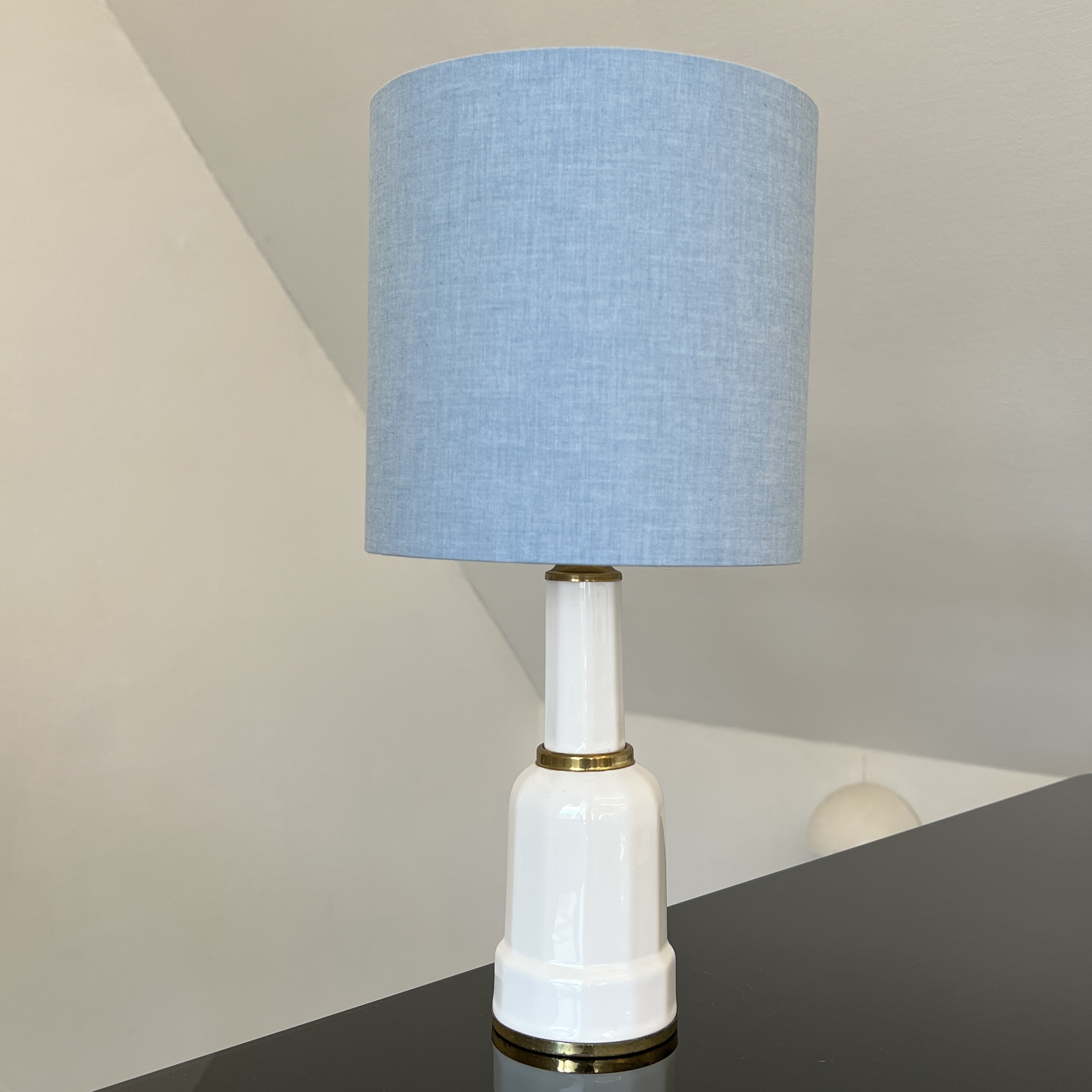Håndlavet lampeskærm i tekstil NR 157-5 CHAMBREY LYSEBLÅ – Klassisk helfarvet lampeskærm i lækkert lyseblåt Chambrey bomuldstekstil – 100% bomuld