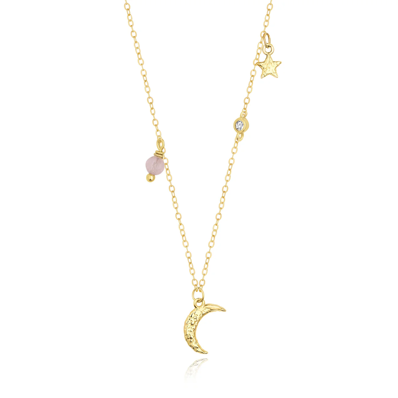 Malu er en feminin halskæde med et legende og drømmende udtryk. Den gyldne kæde prydes af små vedhæng – en tekstureret halvmåne, en stjerne, rosa kvarts, ferskvandsperle og en glitrende blå zirkonia – der tilsammen skaber et poetisk univers. Perfekt som personlig detalje i hverdagen eller til at fremhæve festlige looks med et strejf af mystik.