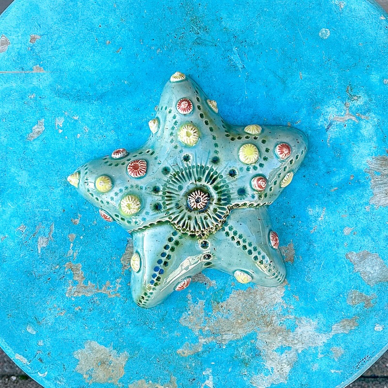 Keramisk vægophæng fra AJH Pottery. Et smukt og karakterfuldt stykke dansk kunsthåndværk i stentøj, klar til let ophængning. Denne håndlavede søstjerne er dekoreret med en unik glasur og detaljer, der giver et levende, næsten illustrativt udtryk.