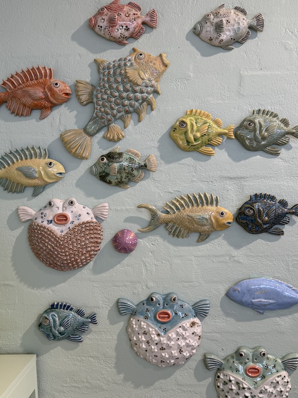 Keramisk vægophæng fra AJH Pottery. Et smukt og karakterfuldt stykke dansk kunsthåndværk i stentøj, klar til let ophængning. Denne håndlavede fisk er dekoreret med en unik glasur og detaljer, der giver et levende, næsten illustrativt udtryk.